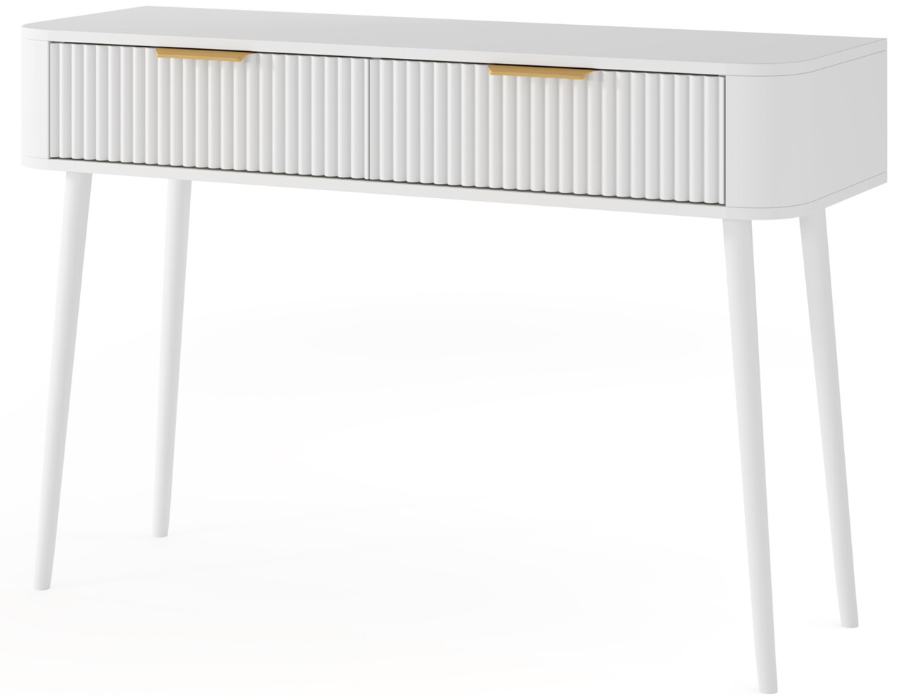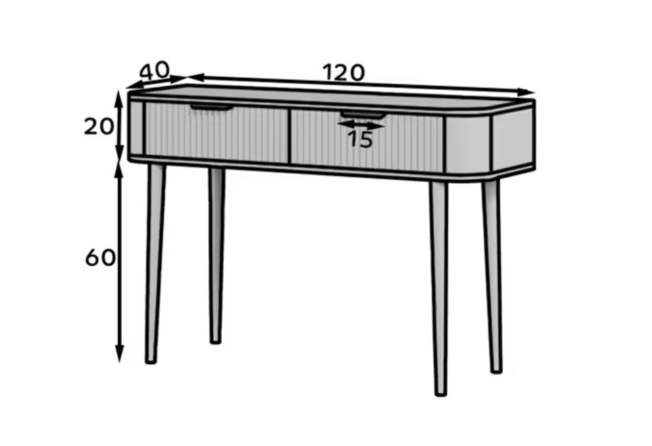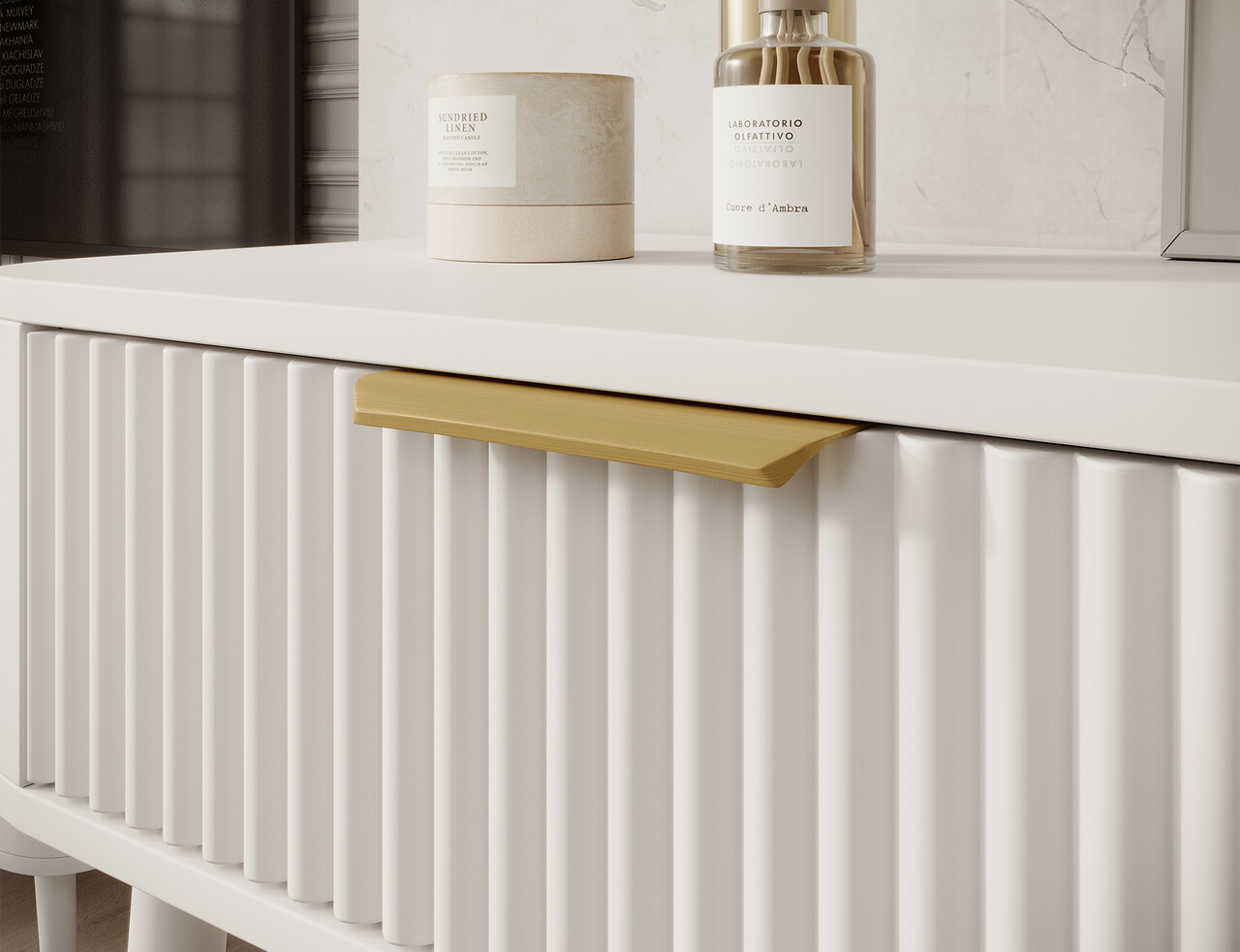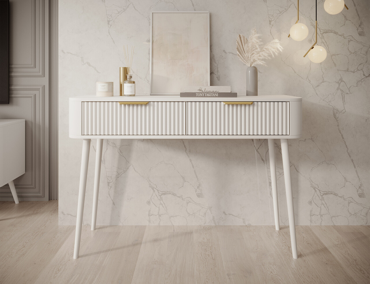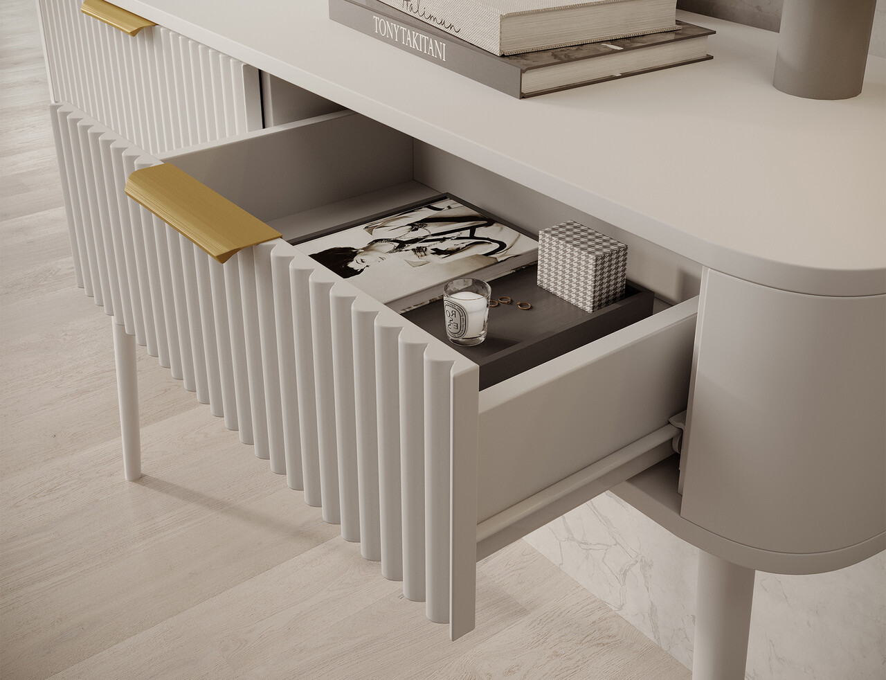 Masa de toaleta Chavelle este o piesa eleganta si functionala de mobilier modern, perfecta pentru dormitor sau dressing. Fatada din MDF durabil cu cant ABS si model canelat confera un aspect rafinat. Corpul din PAL melaminat asigura robustete si durabilitate. Mobilierul are doua sertare practice pe sine cu role, pentru deschidere silentioasa. Picioare inalte albe din lemn (60 cm) adauga eleganta si confort, iar manerele metalice aurii scot in evidenta caracterul modern. Masa de toaleta Chavelle reprezinta o combinatie de design atemporal, functionalitate si calitate de inalta clasa, perfect pentru interioare contemporane.Produsul necesita asamblare.