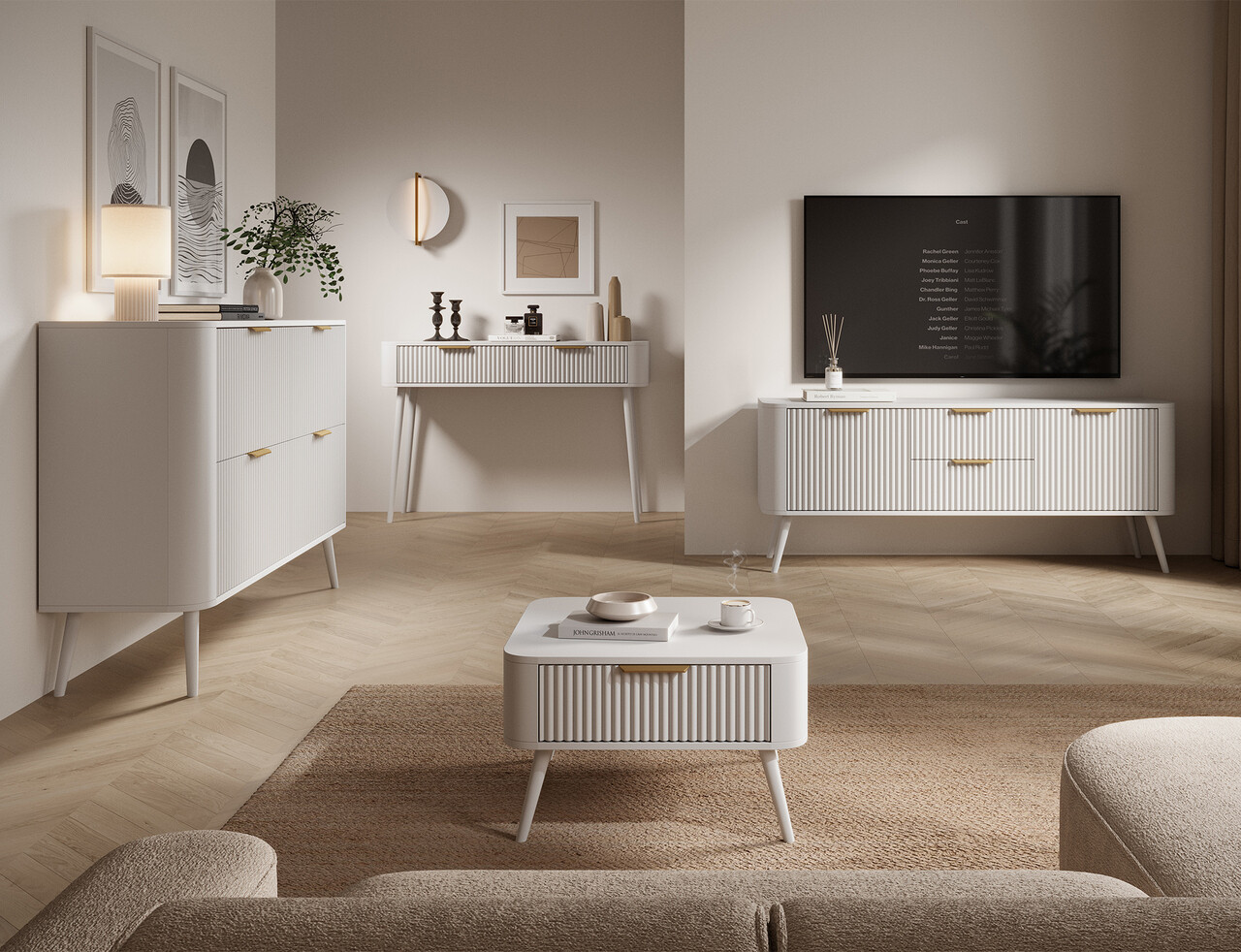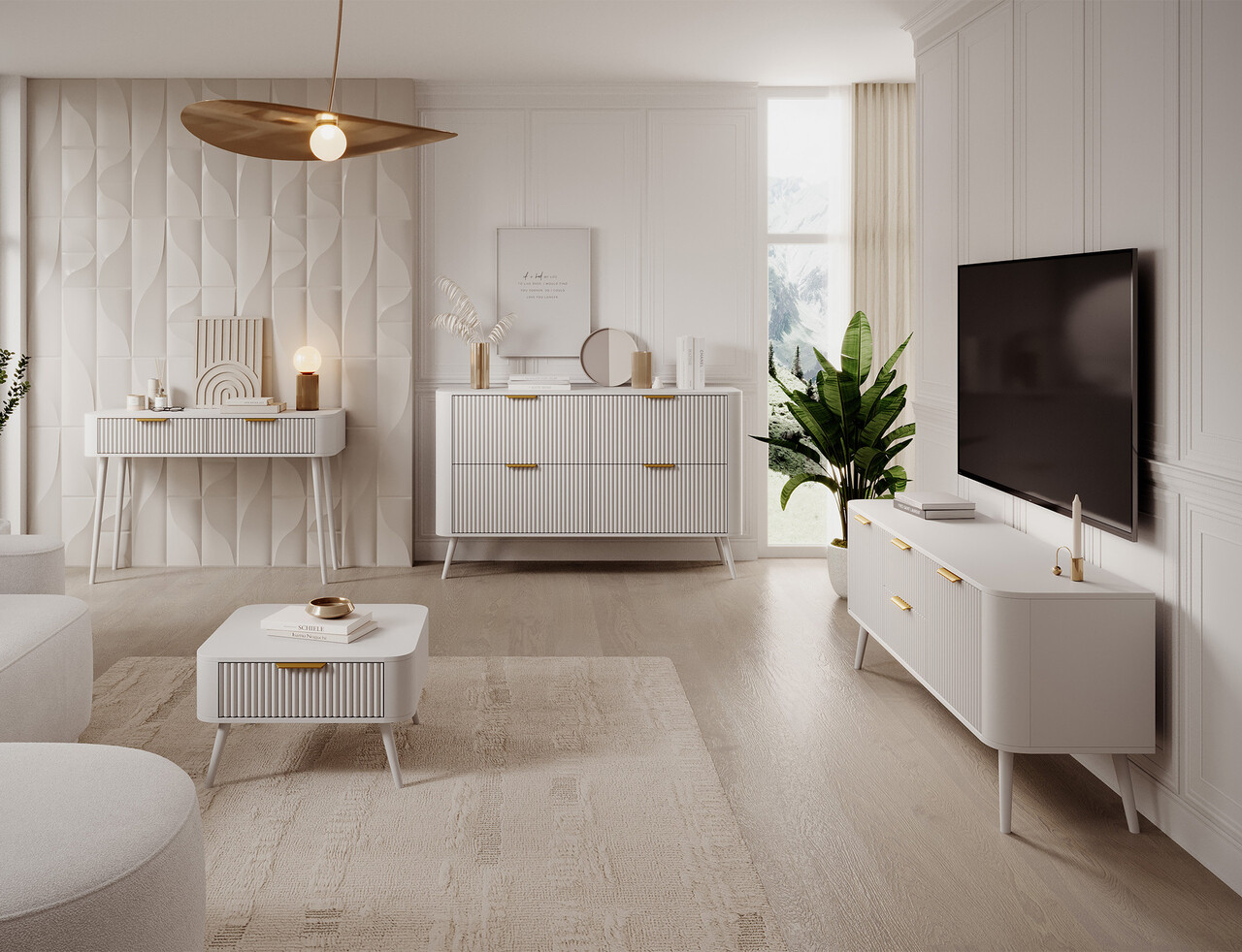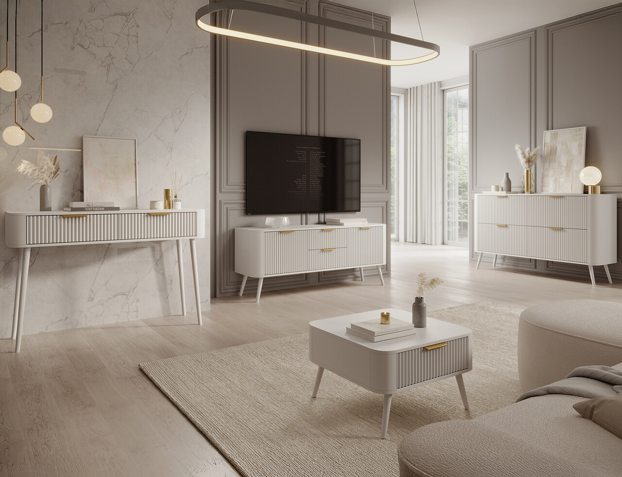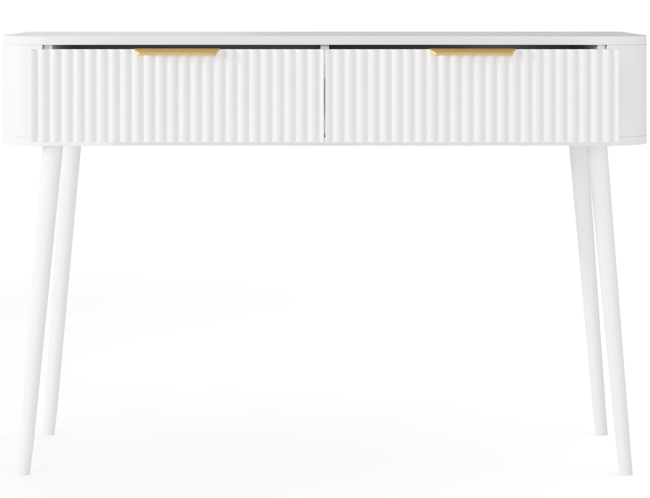 Masa de toaleta Chavelle este o piesa eleganta si functionala de mobilier modern, perfecta pentru dormitor sau dressing. Fatada din MDF durabil cu cant ABS si model canelat confera un aspect rafinat. Corpul din PAL melaminat asigura robustete si durabilitate. Mobilierul are doua sertare practice pe sine cu role, pentru deschidere silentioasa. Picioare inalte albe din lemn (60 cm) adauga eleganta si confort, iar manerele metalice aurii scot in evidenta caracterul modern. Masa de toaleta Chavelle reprezinta o combinatie de design atemporal, functionalitate si calitate de inalta clasa, perfect pentru interioare contemporane.Produsul necesita asamblare.