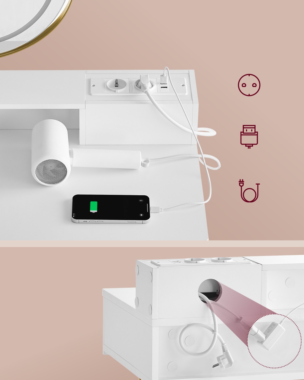 Masa de Toaletă și Machiaj Alb Vasagle - Eleganță și Funcționalitate Descoperă masa de toaletă și machiaj Vasagle, un element esențial pentru orice dormitor sau baie. Cu un design modern și minimalist, această masă nu doar că îți va organiza cosmeticele, dar va adăuga și un aspect elegant încăperii tale. Spațiu Generos de Stocare Beneficiază de un spațiu amplu de depozitare cu un blat de masă generos, două sertare mari și un organizator cu patru compartimente mici, plus un compartiment deschis. Totul va fi la îndemână, iar cosmeticele tale vor fi păstrate ordonat. Oglindă Rotativă cu Iluminare Reglabilă Oglinda rotativă îți permite să o ajustezi după cum ai nevoie, iar cu ajutorul controlului tactil poți schimba culoarea și intensitatea luminii. Astfel, vei obține un machiaj perfect, indiferent de momentul zilei. Stație de Încărcare Practică Nu mai trebuie să te îngrijorezi de lipsa prizelor! Masa de toaletă este dotată cu două prize AC și două porturi USB, astfel încât poți folosi uscătorul de păr sau alte aparate direct de la masă. Un adaptor din spate asigură un port suplimentar pentru lumina oglinzii, menținând cablurile ascunse și ordonate. Stabilitate și Durabilitate Construcția robustă a mesei este asigurată de cele trei tuburi de oțel cu o grosime de 9 mm, combinate cu un lemn de calitate superioară (MDF). Aceasta garantează o stabilitate excelentă și o durată lungă de viață. Design Simplu și Stilat Cu un design simplu, culoarea albă mată și liniile curate, masa de toaletă Vasagle îmbină minimalismul cu un stil modern. Sertarele cu design cu caneluri adaugă un caracter unic camerei tale. Detalii Tehnice Culoare: alb mat - auriu pal Material: lemn MDF, oțel Dimensiuni: 40 x 100 x 134.8 cm (D x L x H) Pachet ambalat: 111 x 54 x 23 cm Greutate totală: 27.4 kg Capacitate maximă de încărcare a blatului: 100 kg Capacitate maximă de încărcare a scaunului: 120 kg Capacitate maximă de încărcare a fiecărui sertar: 5 kg Ce Conține Livrarea 1 x masă de toaletă cu oglindă și iluminare 1 x scaun 1 x dispozitiv anti-răsturnare 1 x pachet de accesorii 1 x instrucțiuni de montaj Îmbunătățește-ți Spațiul cu Masa de Toaletă Vasagle! Nu rata ocazia de a adăuga un element de stil și funcționalitate în casa ta. Comandă acum masa de toaletă și machiaj Vasagle și transformă-ți rutina de frumusețe într-o experiență plăcută!