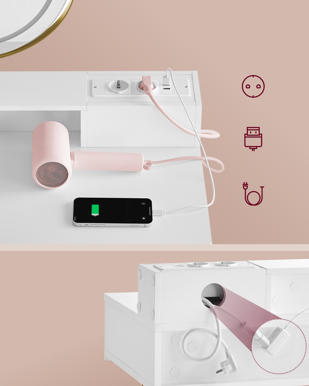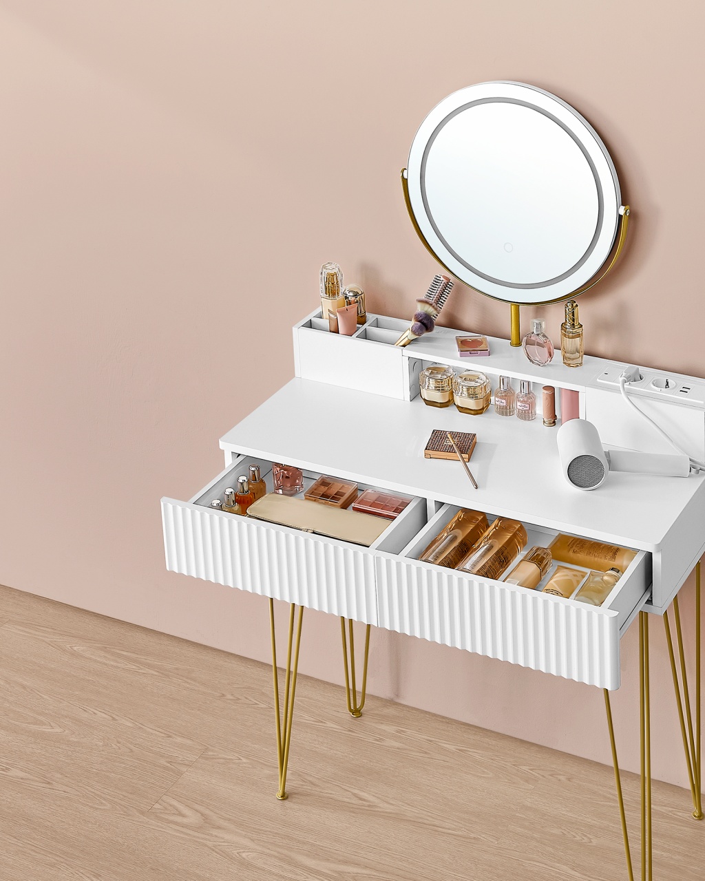 Masa de Toaletă și Machiaj Alb Vasagle Descoperă masa de toaletă și machiaj Vasagle, un element esențial pentru orice dormitor sau baie. Cu un design elegant și modern, această masă îmbină funcționalitatea cu estetica , oferindu-ți un spațiu generos pentru toate produsele tale de înfrumusețare. Spațiu Generos de Depozitare Masa de toaletă dispune de un blat spațios , perfect pentru a-ți aranja cosmeticele. Cu 2 sertare mari, un organizator cu 4 compartimente mici și un compartiment deschis, totul va fi la îndemână și ordonat. Nu mai trebuie să cauți printr-o mulțime de produse, acum le poți avea pe toate la un loc! Oglindă Rotativă cu Iluminare Reglabilă Oglinda rotativă îți permite să o ajustezi după cum ai nevoie, iar cu ajutorul controlului tactil poți schimba culoarea și intensitatea luminii. Astfel, vei obține un machiaj perfect, indiferent de momentul zilei. Stație de Încărcare Practică Nu mai trebuie să te îngrijorezi de lipsa prizelor! Masa de toaletă este dotată cu 2 prize AC și 2 porturi USB, astfel încât poți folosi uscătorul de păr sau alte aparate direct de la masă. Un adaptor din spate oferă un port suplimentar pentru lumina oglinzii, menținând cablurile ascunse și ordonate. Stabilitate și Durabilitate Construcția robustă a mesei de toaletă este asigurată de picioarele realizate din 3 tuburi de oțel rezistente, fiecare având o grosime de 9 mm. Împreună cu placa de lemn de calitate superioară, masa oferă o stabilitate excelentă și o durată lungă de viață. Design Simplu și Elegant Cu un design minimalist, culoarea albă și liniile curate, masa de toaletă Vasagle se integrează perfect în orice decor. Sertarele cu un design cu caneluri adaugă un caracter unic camerei tale, făcând din acest produs o alegere excelentă pentru orice spațiu. Detalii Tehnice Culoare: alb mat - auriu pal Material: lemn PAL, MDF (lemn de fibră de densitate medie), oțel, burete, țesătură de catifea, oglindă, țesătură nețesută Dimensiuni: 40 x 80 x 134.8 cm (D x L x H) Pachet ambalat: 93 x 55.5 x 24 cm Greutate totală: 24.3 kg Capacitate maximă de încărcare a blatului: 100 kg Capacitate maximă de încărcare a scaunului: 120 kg Capacitate maximă de încărcare a fiecărui sertar: 5 kg Ce Conține Livrarea 1 x masă de toaletă cu oglindă și iluminare 1 x scaun 1 x dispozitiv anti-răsturnare 1 x pachet de accesorii 1 x instrucțiuni de montaj Îmbunătățește-ți Spațiul Acum! Nu rata ocazia de a adăuga un strop de eleganță și funcționalitate în viața ta! Comandă acum masa de toaletă și machiaj Vasagle și transformă-ți rutina de înfrumusețare într-o experiență plăcută și organizată!