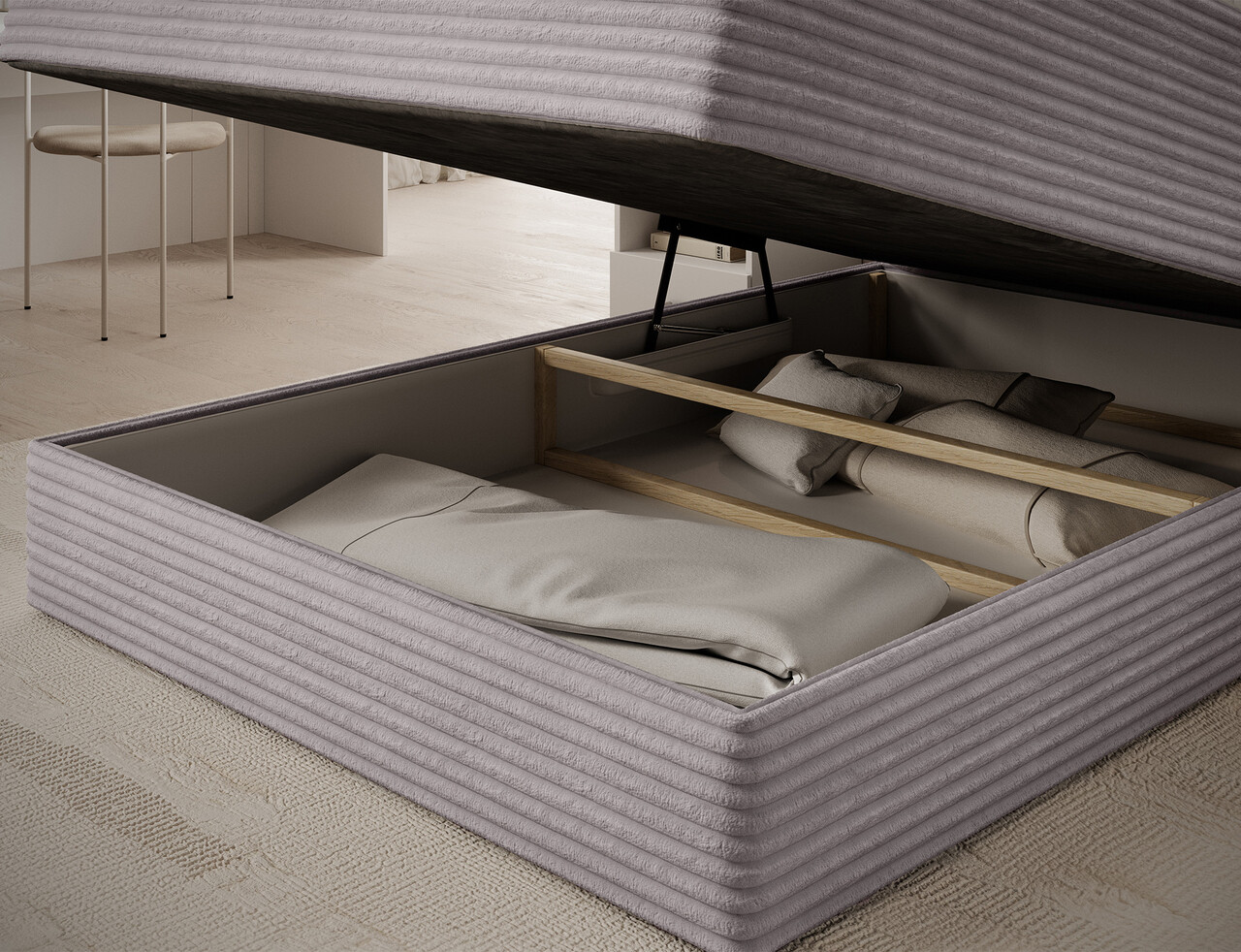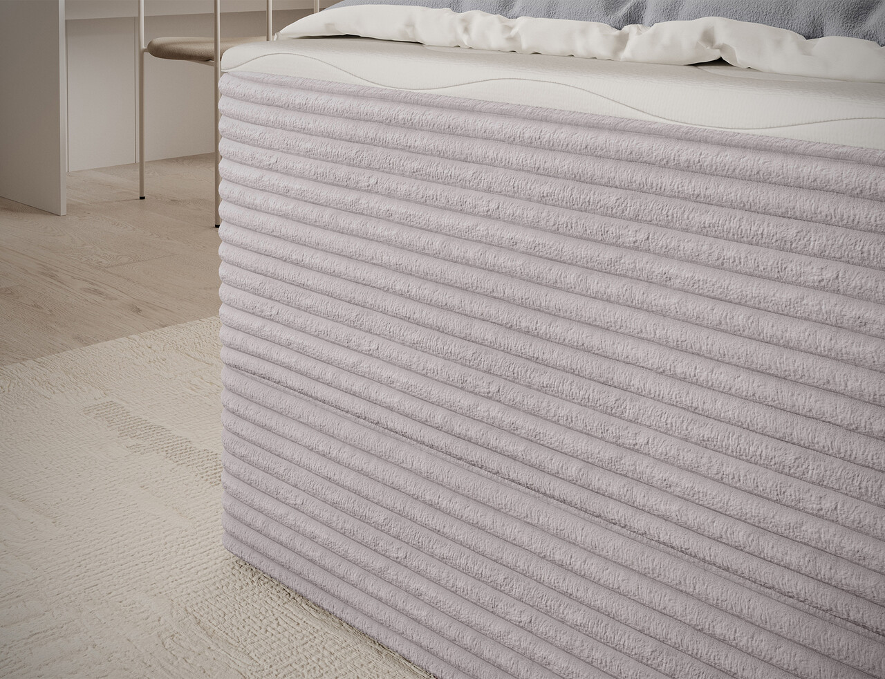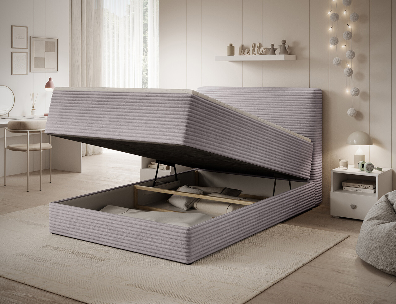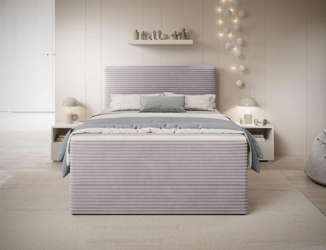 Pat continental tapitat cu lada depozitare 140x200 cm ELTAP Alamito lemn/poliester gri deschis