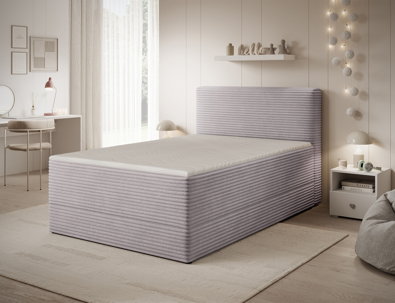 Patul boxspring Alamito este un pat continental functional si confortabil, proiectat pentru un somn odihnitor si utilizare zilnica, fiind o alegere practica pentru dormitor. Constructia solida, cu o inaltime de 108 cm si o lungime de 215 cm, asigura stabilitate si suport adecvat, iar materialele atent selectionate contribuie la durabilitate si confort. Spatarul este umplut cu spuma T2130 de 5 cm grosime, iar corpul este realizat dintr-o combinatie de spuma T2130, arcuri bonell si spuma T2540, garantand elasticitate si confort in timpul somnului. Patul este completat de un topper de 5 cm grosime care sporeste confortul si adaptarea la corp. Dispune de un spatiu de depozitare practic pentru lenjerie care faciliteaza organizarea si permite o utilizare mai eficienta a spatiului din dormitor. Structura include un cadru cu saltea bonell fixata permanent pe un suport din lemn masiv si PAL, oferind o baza solida si o durata lunga de viata a mobilierului. Modelul Alamito este disponibil in doua dimensiuni: 120x200 cm si 140x200 cm, fiind ideal atat pentru dormitoare mici, cat si pentru cele de dimensiuni medii, imbinand estetica, functionalitatea si un standard ridicat de confort al somnului.Compozitie materialMaterial tapiterie: 100% poliester (tesatura primara Modullo 03).Material cadru: lemn de pinUmplutura sezut: spuma T2130, unitate cu arcuri Bonell, spuma T2540Umplutura tablie: spuma T2130Picioare din plastic de culoare neagra.Informatii si dimensiuni specificeInaltime sezut: 63 cmInaltime picioare: 1.5 cmSuprafata de dormit: 140x200 cmCompartiment depozitare: 1Greutatea maxima suportata: 220 kgProdusul necesita asamblare.