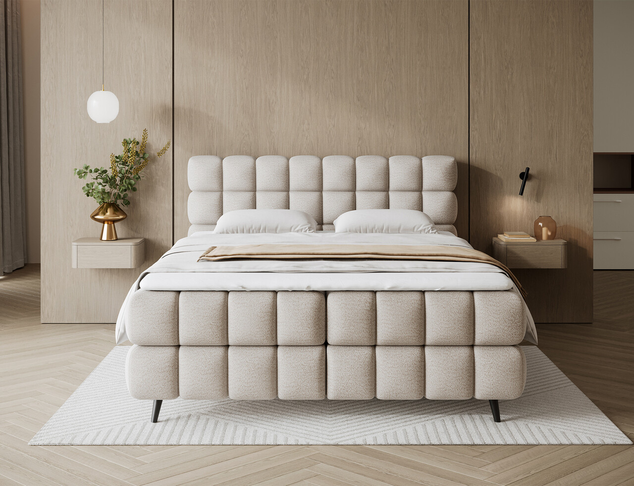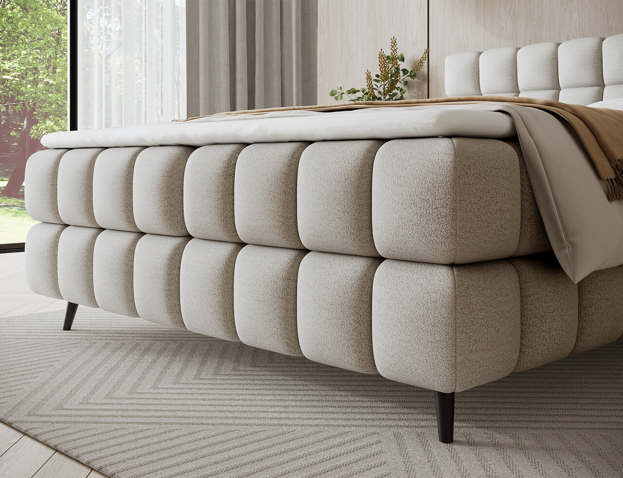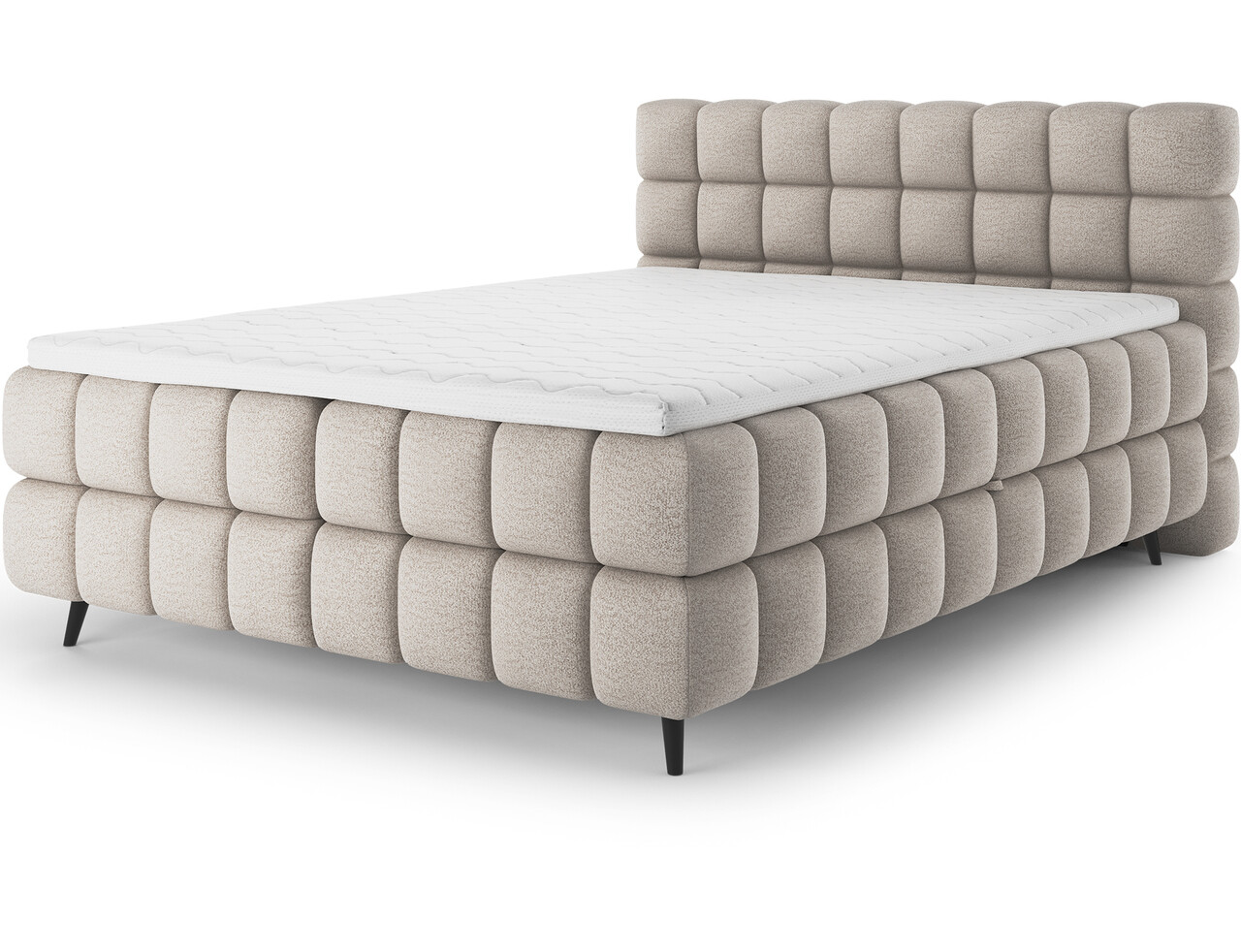 Patul continental Sabeno este o alegere eleganta si functionala pentru orice dormitor modern. Modelul este disponibil in trei variante de dimensiuni: 140x200 cm, 160x200 cm si 180x200 cm, permitandu-va sa ajustati latimea patului in functie de nevoile individuale. Inaltimea totala a structurii este de 111 cm, iar lungimea de 222 cm, oferind patului un aspect stabil si impunator. Confortul in timpul somnului este asigurat de combinatia dintre arcurile Bonell si spuma T2540 care ofera sustinere adecvata si durabilitate. Patul Sabeno este echipat cu un compartiment practic pentru depozitarea lenjeriei care ajuta la mentinerea ordinii in dormitor. Picioarele negre din lemn completeaza designul, adaugand eleganta subtila si lejeritate. Stilul modern al patului Sabeno il face sa se potriveasca perfect atat in interioare minimaliste, cat si in amenajari mai expresive. Datorita functionalitatii, materialelor de inalta calitate si finisajului estetic, patul continental Sabeno este alegerea ideala pentru cei care apreciaza confortul, durabilitatea si mobilierul de dormitor stilat.Compozitie materialMaterial tapiterie: 100% poliester (tesatura primara Royal 18).Material cadru: lemn de pinUmplutura sezut: spuma T2540 si arcuri BonellGrosime topper: 5 cmUmplutura spatar: spuma T2130Picioare din lemn de culoare neagra.Informatii si dimensiuni specificeInaltime sezut: 56 cmInaltime picioare: 11 cmGreutatea maxima suportata: 220 kgCompartiment depozitare: 2Dimensiuni compartiment depozitare: 196x52x20 cmSuprafata de dormit: 140x200 cmProdusul necesita asamblare.