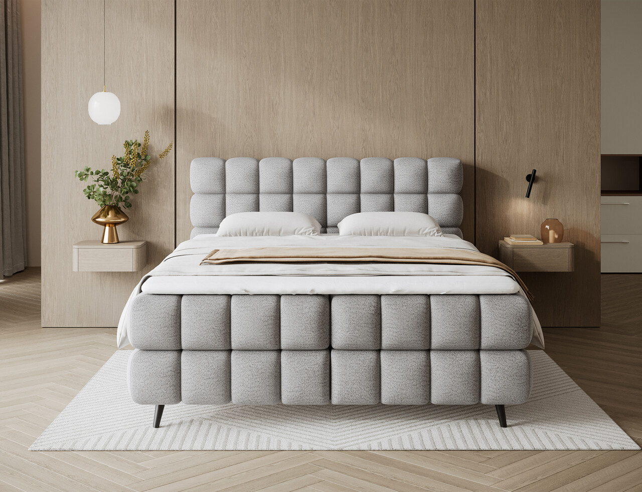 Patul continental Sabeno este o alegere eleganta si functionala pentru orice dormitor modern. Modelul este disponibil in trei variante de dimensiuni: 140x200 cm, 160x200 cm si 180x200 cm, permitandu-va sa ajustati latimea patului in functie de nevoile individuale. Inaltimea totala a structurii este de 111 cm, iar lungimea de 222 cm, oferind patului un aspect stabil si impunator. Confortul in timpul somnului este asigurat de combinatia dintre arcurile Bonell si spuma T2540 care ofera sustinere adecvata si durabilitate. Patul Sabeno este echipat cu un compartiment practic pentru depozitarea lenjeriei care ajuta la mentinerea ordinii in dormitor. Picioarele negre din lemn completeaza designul, adaugand eleganta subtila si lejeritate. Stilul modern al patului Sabeno il face sa se potriveasca perfect atat in interioare minimaliste, cat si in amenajari mai expresive. Datorita functionalitatii, materialelor de inalta calitate si finisajului estetic, patul continental Sabeno este alegerea ideala pentru cei care apreciaza confortul, durabilitatea si mobilierul de dormitor stilat.Compozitie materialMaterial tapiterie: 100% poliester (tesatura primara Royal 04).Material cadru: lemn de pinUmplutura sezut: spuma T2540 si arcuri BonellGrosime topper: 5 cmUmplutura spatar: spuma T2130Picioare din lemn de culoare neagra.Informatii si dimensiuni specificeInaltime sezut: 56 cmInaltime picioare: 11 cmGreutatea maxima suportata: 240 kgCompartiment depozitare: 2Dimensiuni compartiment depozitare: 196x72x20 cmSuprafata de dormit: 160x200 cmProdusul necesita asamblare.