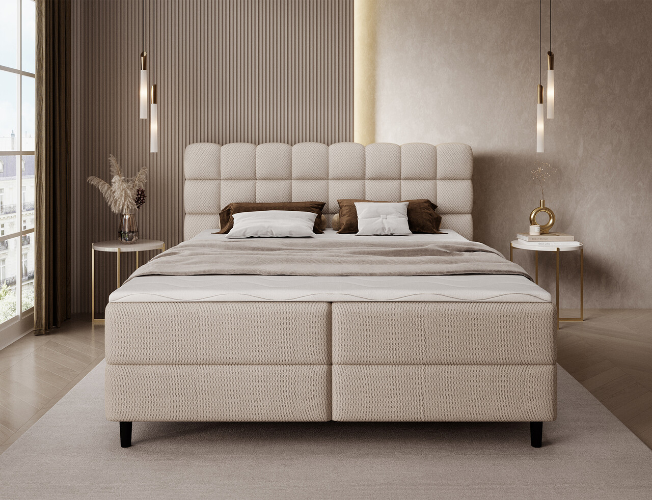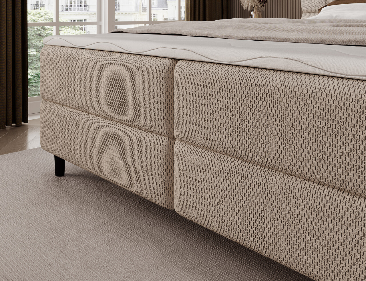 Patul continental Camma imbina designul modern, functionalitatea si confortul somnului, fiind alegerea perfecta pentru un dormitor elegant si practic. Disponibil in trei variante de dimensiuni – 140x200 cm, 160x200 cm si 180x200 cm – permite o adaptare ideala la spatiu si la nevoile utilizatorilor, iar constructia solida, cu o inaltime totala de 102 cm si o inaltime a sezutului de 56 cm, asigura confortul zilnic; lungimea patului este de 222 cm, iar latimea variaza in functie de model – 162 cm, 182 cm sau 202 cm – oferind un aspect stabil si masiv care subliniaza caracterul prestigios al interiorului. Tapitat cu o tesatura de inalta calitate, placuta la atingere, se remarca prin tablia estetica cu matlasare eleganta, adaugand o nota de eleganta moderna si oferind un sprijin ideal pentru momentele de relaxare de seara. Lada de depozitare practica pentru lenjeria de pat ajuta la mentinerea ordinii in dormitor si la utilizarea optima a spatiului, ceea ce face ca patul Camma sa fie nu doar confortabil, ci si extrem de functional. Intregul ansamblu este completat de picioare negre din lemn, cu o inaltime de 10 cm care ofera lejeritate constructiei si faciliteaza curatenia sub pat. Modelul Camma este alegerea ideala pentru cei care apreciaza stilul modern, eleganta, durabilitatea si confortul, garantand un somn sanatos si linistit in fiecare zi.Compozitie materialMaterial tapiterie: 100% poliester (tesatura primara Calmora 18).Material cadru: lemn de pinUmplutura sezut: spuma T2540Grosime topper: 4 cmUmplutura spatar: spuma T2130Picioare din lemn de culoare neagra.Informatii si dimensiuni specificeInaltime sezut: 56 cmInaltime picioare: 10 cmGreutatea maxima suportata: 260 kgCompartiment depozitare: 2Dimensiuni compartiment depozitare: 182x86x15 cmSuprafata de dormit: 180x200 cmProdusul necesita asamblare.