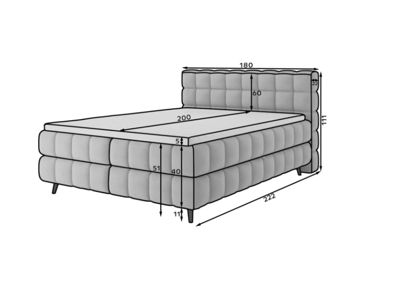Patul continental Sabeno este o alegere eleganta si functionala pentru orice dormitor modern. Modelul este disponibil in trei variante de dimensiuni: 140x200 cm, 160x200 cm si 180x200 cm, permitandu-va sa ajustati latimea patului in functie de nevoile individuale. Inaltimea totala a structurii este de 111 cm, iar lungimea de 222 cm, oferind patului un aspect stabil si impunator. Confortul in timpul somnului este asigurat de combinatia dintre arcurile Bonell si spuma T2540 care ofera sustinere adecvata si durabilitate. Patul Sabeno este echipat cu un compartiment practic pentru depozitarea lenjeriei care ajuta la mentinerea ordinii in dormitor. Picioarele negre din lemn completeaza designul, adaugand eleganta subtila si lejeritate. Stilul modern al patului Sabeno il face sa se potriveasca perfect atat in interioare minimaliste, cat si in amenajari mai expresive. Datorita functionalitatii, materialelor de inalta calitate si finisajului estetic, patul continental Sabeno este alegerea ideala pentru cei care apreciaza confortul, durabilitatea si mobilierul de dormitor stilat.Compozitie materialMaterial tapiterie: 100% poliester (tesatura primara Royal 20).Material cadru: lemn de pinUmplutura sezut: spuma T2540 si arcuri BonellGrosime topper: 5 cmUmplutura spatar: spuma T2130Picioare din lemn de culoare neagra.Informatii si dimensiuni specificeInaltime sezut: 56 cmInaltime picioare: 11 cmGreutatea maxima suportata: 260 kgCompartiment depozitare: 2Dimensiuni compartiment depozitare: 196x92x20 cmSuprafata de dormit: 180x200 cmProdusul necesita asamblare.