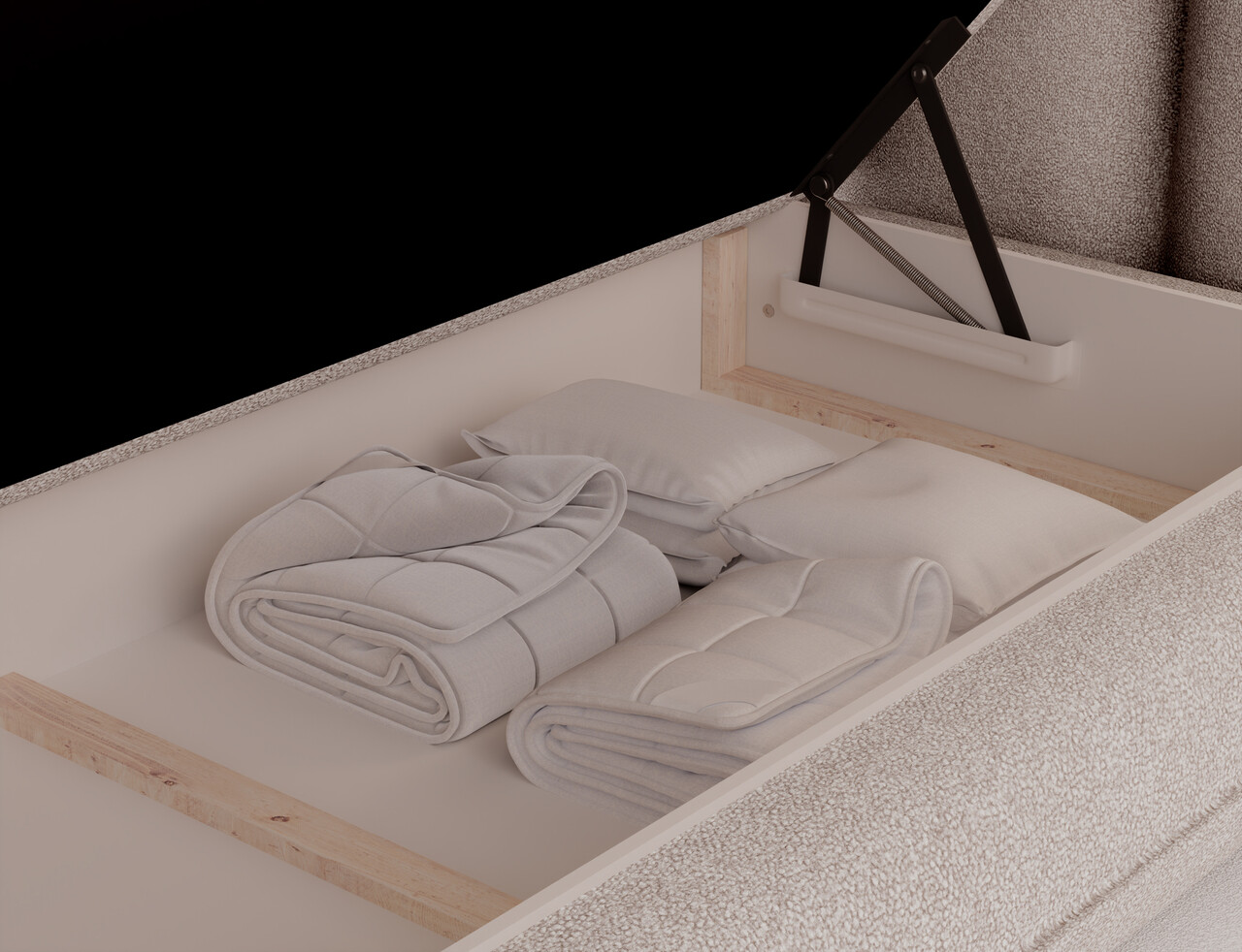 Pat tapitat cu lada depozitare 140x200 cm ELTAP Tonila lemn/poliester bej deschis