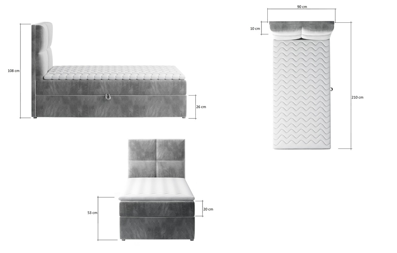 Rivia este un pat single intr-un stil clasic care va fi piesa perfecta de mobilier in orice tip de dormitor - fie la copilul dumneavoastra, fie intr-o camera pregatita pentru oaspeti - Rivia este intotdeauna un succes. Suprafata patului de 90 x 200 cm, precum si arcurile Bonnell si umplutura din spuma T25 garanteaza un somn sanatos deoarece acest tip de saltea sustine corpul in pozitia corecta in timpul odihnei. Desi patul Rivia pare minimalist si compact, are un recipient spatios pentru asternut cu maner din tesatura. Alte caracteristici distinctive includ un sezut inalt de 53 cm si picioare de 2 cm. Boxspring Rivia este alegerea perfecta daca sunteti in cautarea patului de o persoana perfect pentru dormitorul dumneavoastra. Rivia este sinonim cu o dimensiune mai mica combinata cu un confort maxim.Compozitie materialMaterial tapiterie: 100% poliester (tesatura primara Paros 05).Material cadru: lemn de pinUmplutura sezut: arcuri Bonell si spuma-T25Picioare din plastic de culoare argintie.Informatii si dimensiuni specificeInaltime sezut: 53 cmInaltime picioare: 2 cmCompartiment depozitare: 1Suprafata de dormit: 90x200 cmProdusul necesita asamblare, asamblat partial.