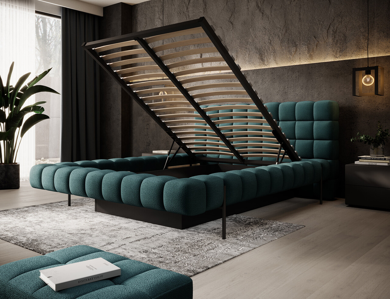 Pat tapitat cu somiera rabatabila si lada depozitare 140x200 cm ELTAP Magentta metal/poliester verde