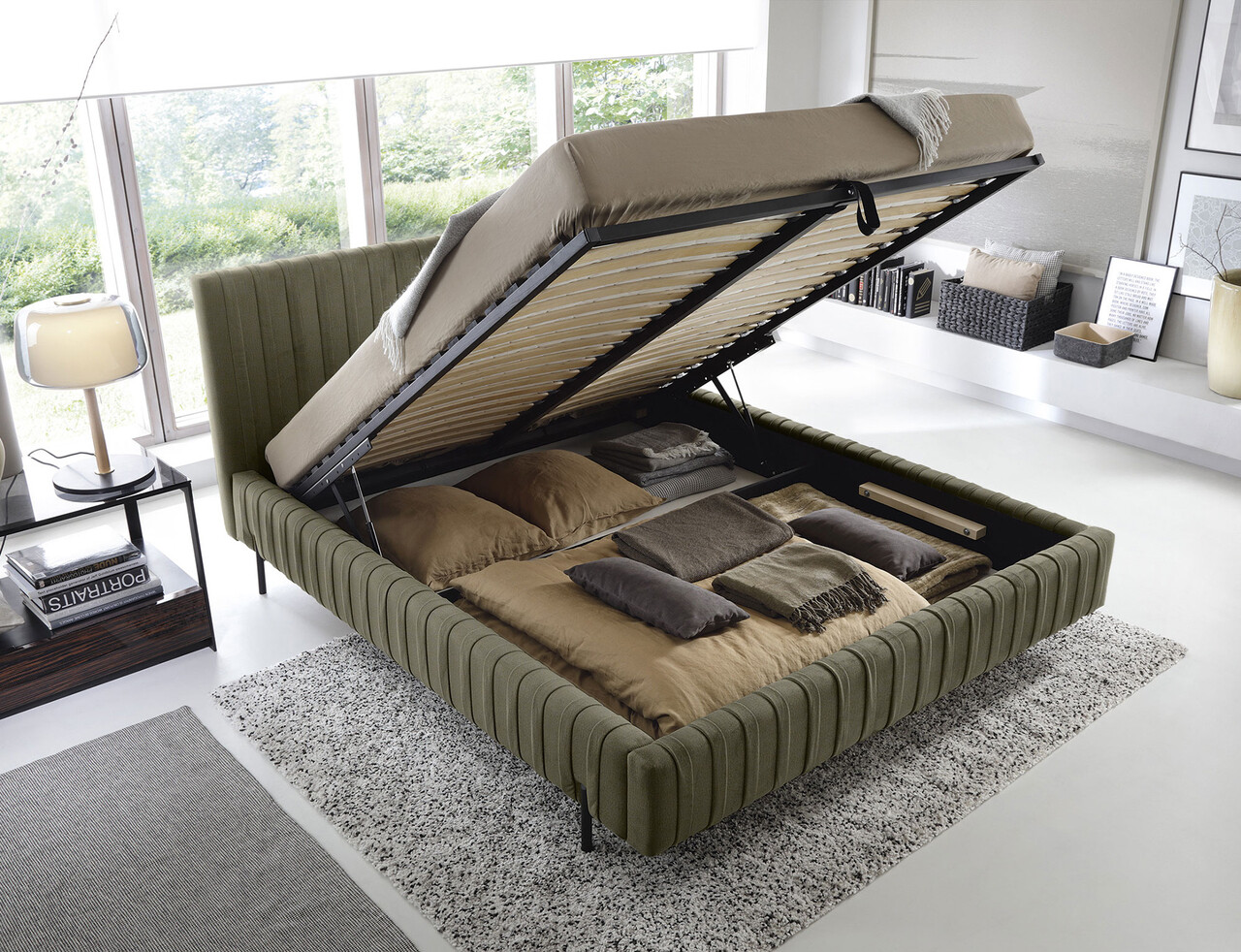 Pat tapitat cu somiera rabatabila si lada depozitare 180x200 cm ELTAP Plissa metal/poliester verde olive