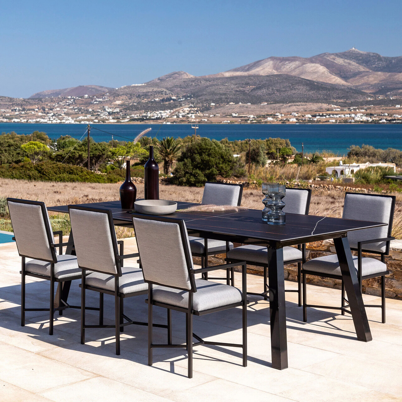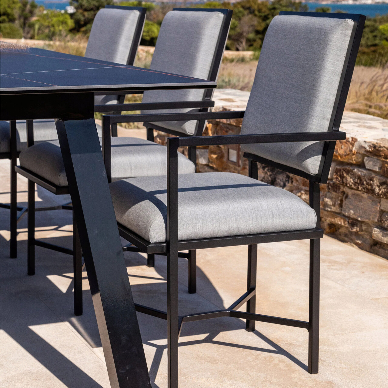 Realizate din structura solida de aluminiu vopsita in camp electrostatic. Sezutul si spatarul sunt imbracate cu tesatura Sunbrella impermeabila si cu protectie garantata impotriva decolorarii.