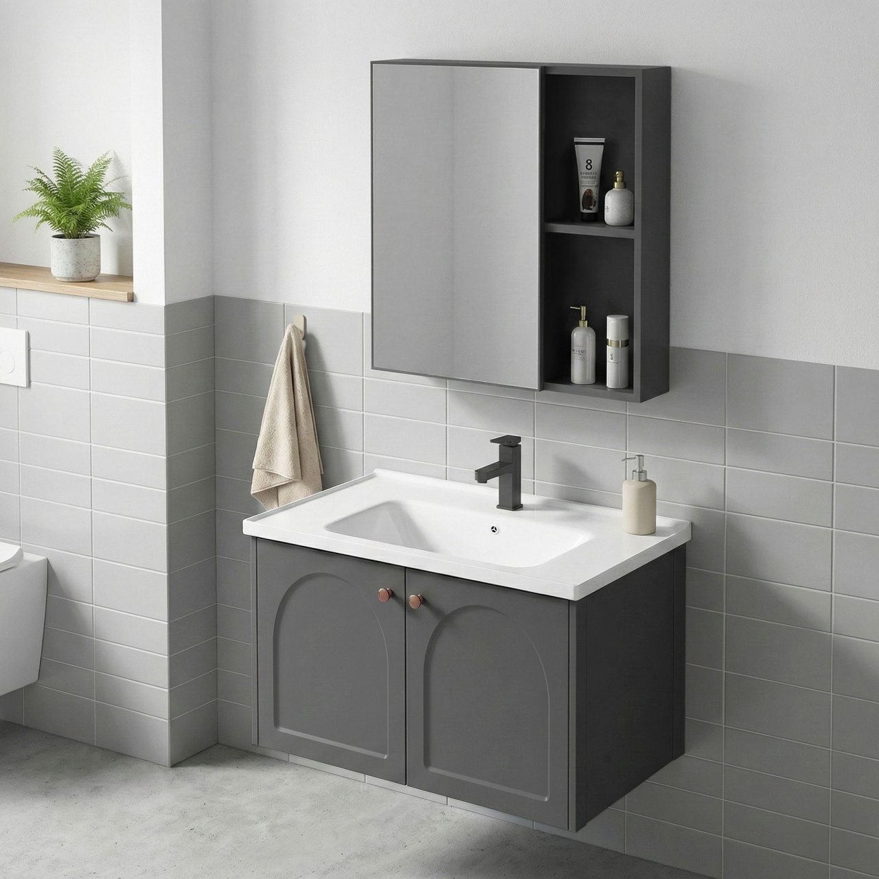 Optimizează spațiul din baia ta cu ajutorul setului de mobilier de baie Rea Denver. Este o soluție practică ce îmbină funcționalitatea zilnică cu un spațiu suplimentar de depozitare, facilitând organizarea chiar și în încăperi mai mici. Construcția compactă face ca setul să se potrivească în aproape orice baie, oferind confortul necesar în fiecare zi.Setul nostru de mobilier de baie oferă o serie de avantaje practice:Zonă dublă de depozitare – dulapul de sub lavoar și dulapul cu oglindă permit organizarea comodă a cosmeticelor și a accesoriilor de baie. Corpul mobilierului este realizat din plastic ușorDulap suspendat – facilitează accesul la podea în timpul curățeniei, ajutând la menținerea igienei în întreaga încăpere Oglindă mare – o oglindă practică amplasată pe ușa dulapului superior, care asigură acces ușor la cosmeticele de pe rafturi Lavoar ceramic – suprafața netedă este ușor de curățat și rezistentă la utilizarea zilnicăMânere clasice de culoare cupru deschis – reprezintă un accent practic care facilitează deschiderea fronturilor decorate cu frezare delicată Setul de mobilier de baie Rea Denver este o propunere pentru persoanele care caută soluții gata făcute și simple. Combinația dintre dulapurile din plastic și lavoarul ceramic creează o structură ușoară, care oferă funcționalitatea necesară și spațiu de depozitare în baie. Culoare: Gri Metodă de montaj: Suspendată Material: Ceramică sanitară, Plastic Latime : 600 Adâncime: 480