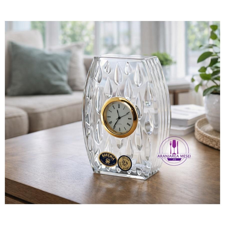 Ceasul din cristal Bohemia cu cadran auriu de 11.5 cm îmbină rafinamentul și eleganța caracteristice măiestriei cehe. Fiecare detaliu al acestui ceas este realizat cu o precizie deosebită, reflectând claritatea și frumusețea cristalului de Bohemia, recunoscut la nivel mondial. Designul său sofisticat și strălucirea aurie a cadranului transformă acest ceas într-o piesă de decor unică, perfectă pentru a adăuga un strop de lux oricărui interior. O adevărată bijuterie care va impresiona prin stil și calitate!