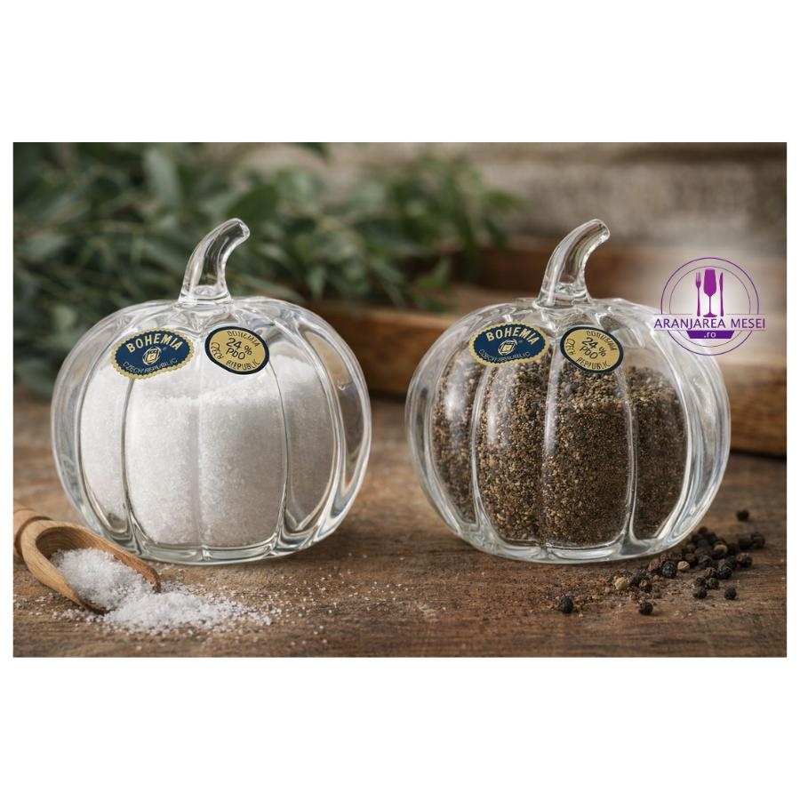 Setul de solnițe sare/piper DOVLEAC din cristal Bohemia îmbină tradiția artisanală cehă cu un design elegant și rafinat. Fiecare solniță este realizată cu măiestrie, evidențiind claritatea și frumusețea caracteristică cristalului de Bohemia. Forma inedită de dovleac adaugă un strop de originalitate, transformându-le în piese de decor ce atrag privirile. Acest set reprezintă nu doar un accesoriu funcțional, ci și o declarație de stil pentru orice masă, fiind apreciat de cunoscători pentru eleganța sa inegalabilă.