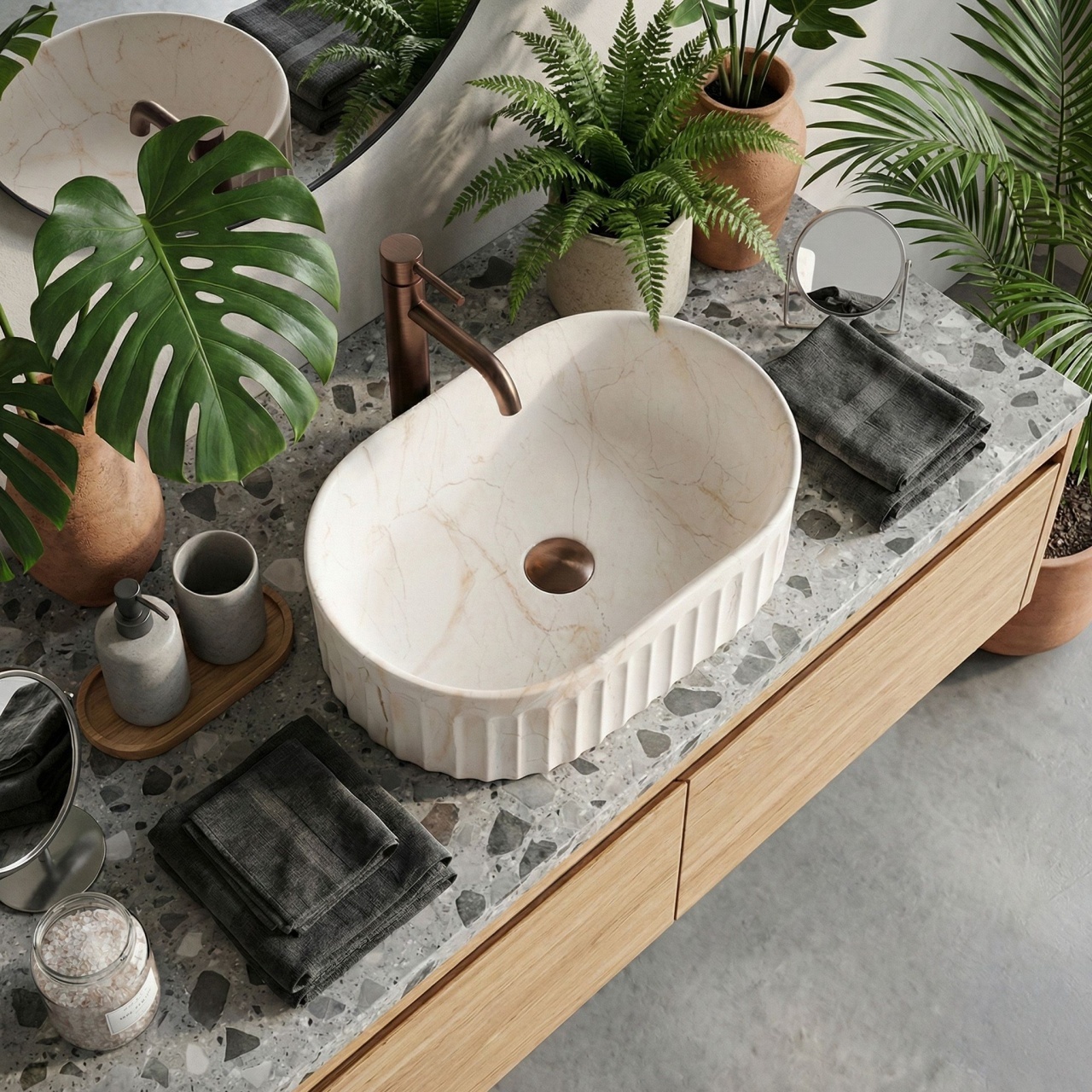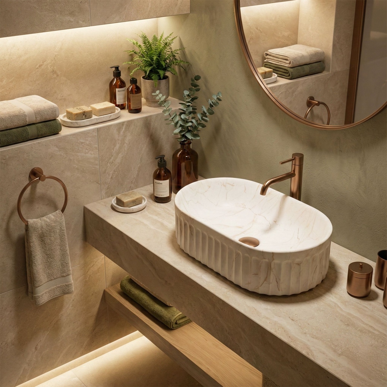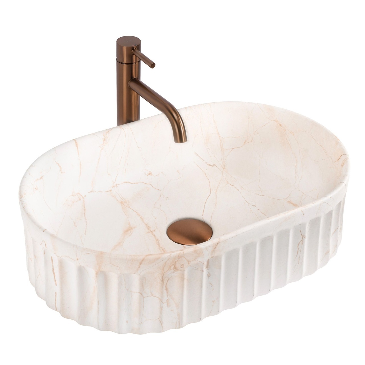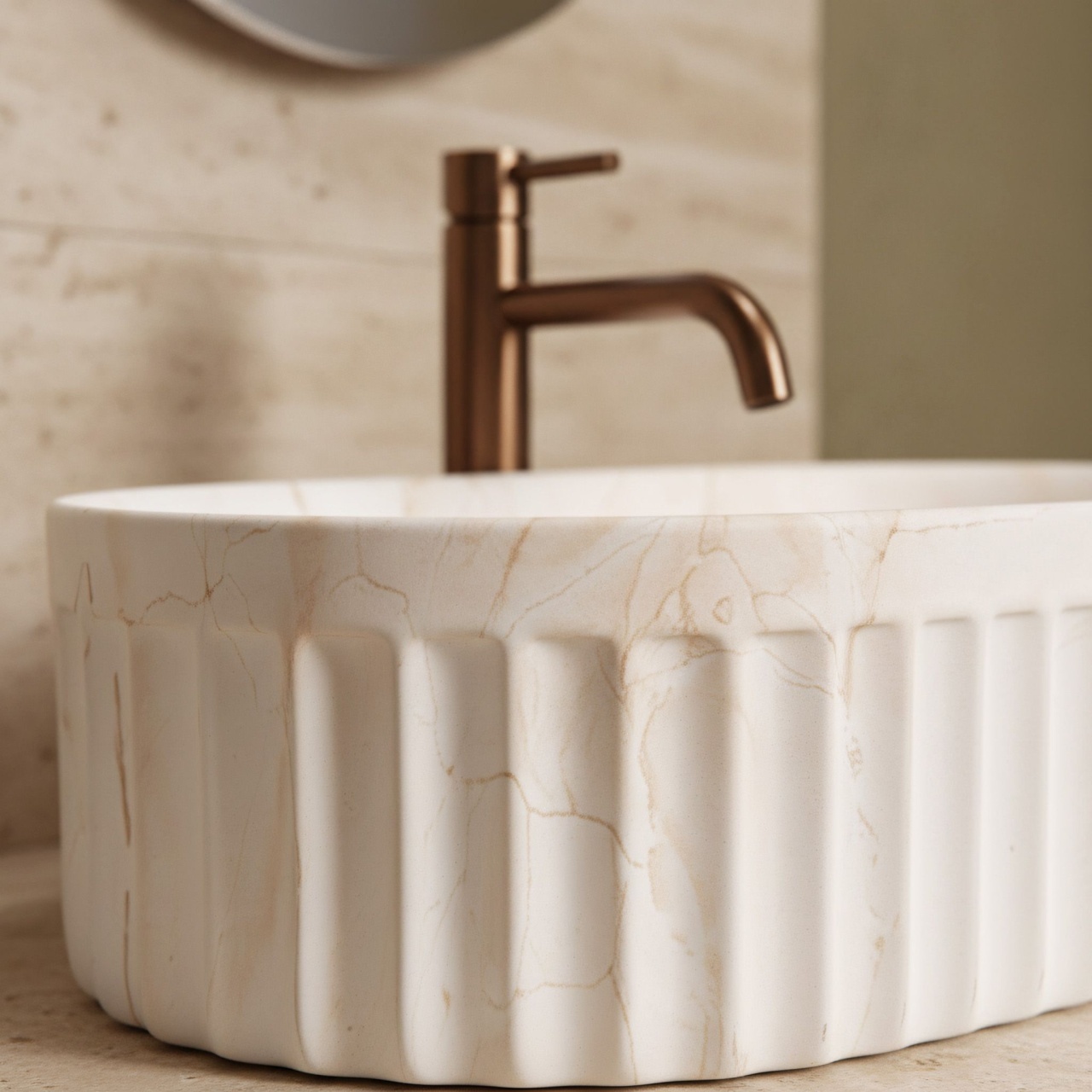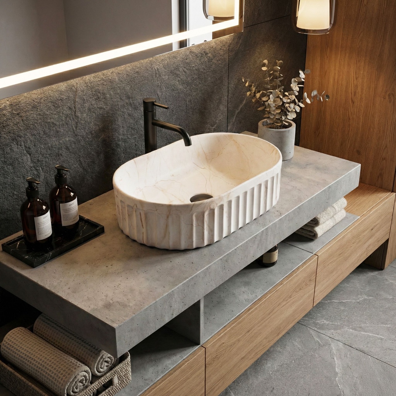 Descoperă un design unic și o funcționalitate practică datorită lavoarului pe blat Georgia. Acest model combină ceramica durabilă, verificată în timp, cu cele mai noi tendințe de amenajare. Se remarcă prin structura exterioară canelată și finisajul mat subtil cu model de piatră, oferind zonei de spălare un caracter modern și expresiv.Structură canelată – suprafața exterioară a cuvei are caneluri verticale. Este un detaliu foarte la modă, care sparge suprafețele netede, oferă lejeritate formei și se potrivește excelent cu alte elemente canelate din baie, de exemplu fronturile mobilierului.Finisaj mat cu motiv de piatră – lavoarul impresionează printr-un model ce imită marmura naturală cu venaturi fine, ruginite. Suprafața mată este nu doar estetică, ci și practică în utilizarea de zi cu zi.Ceramică sanitară durabilă – realizat din material de înaltă calitate, cu rezistență ridicată la zgârieturi și lovituri, pentru un aspect impecabil ani la rând.Montaj pe blat – lavoarul este destinat instalării direct pe blat sau pe mobilier. Această soluție crește confortul și permite obținerea unui spațiu suplimentar în jurul cuvei pentru cosmetice.Formă ovală ergonomică – forma fluidă, fără colțuri ascuțite, facilitează scurgerea apei și face ca curățarea zilnică să fie rapidă și fără efort.Lavoarul pe blat Georgia este alegerea ideală pentru cei care caută elemente originale, dar practice. Designul canelat și modelul mat de piatră creează un ansamblu coerent, care va deveni un punct forte în orice baie modernă. Metodă de montaj: De blat Material: Ceramică sanitară Culoare: Bej, Imitație piatră Finisaj: Mat Lungime: 350 Latime : 550 Inalime: 150 Adâncime: 115 Formă: Oval