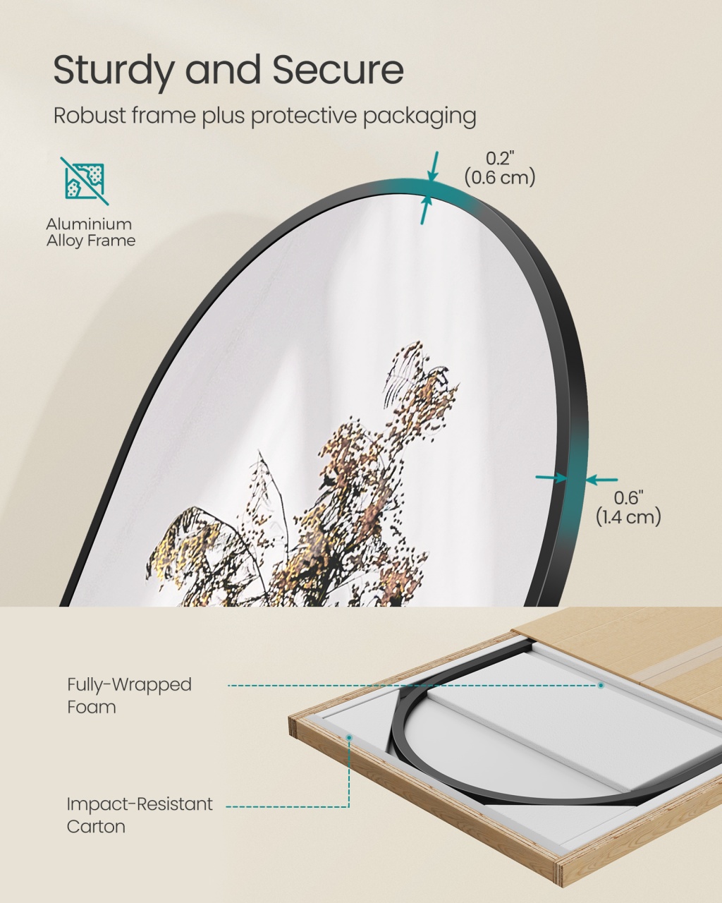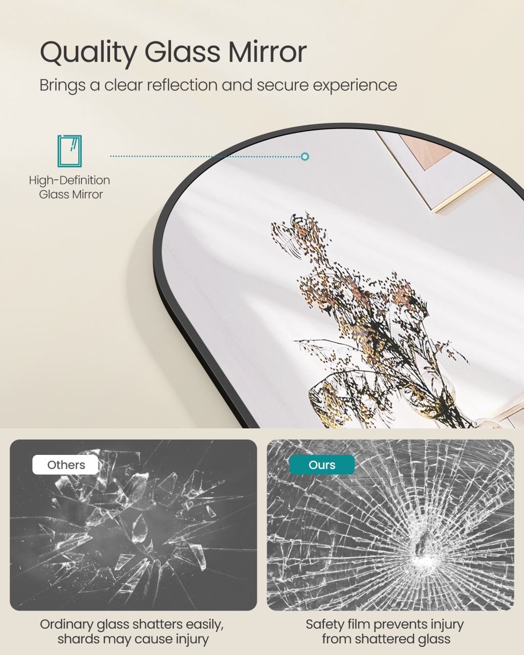 Oglinda de podea Gloria, Negru — Vedere completă de la cap la picioare Design și materiale de calitate Arcul elegant al ramei în nuanța Negru lucios transformă oglinda într-un punct focal cald și rafinat pentru dormitor sau living. Rama este realizată din Metal (Aluminiu) , iar suprafața reflectorizantă este din sticlă temperată cu film de siguranță, oferind atât estetică, cât și rezistență. Se potrivește armonios alături de piese din Lemn PAL și Lemn MDF , adăugând o notă sofisticată fiecărui interior. Funcționalitate și organizare Cu dimensiunile generoase de 150 x 40 cm , oglinda oferă o vedere completă a ținutei, fie stai în fața ei, fie o agăți pe perete. Designul cu picioare permite plasarea liberă în orice colț, iar greutatea redusă de 4.9 kg facilitează mobilitatea și repoziționarea rapidă. Această oglindă combină utilitatea de zi cu zi cu valoarea decorativă, oferind stabilitate și eleganță în același timp. Montaj și întreținere Produsul vine gata de utilizare , fără necesitatea asamblării: scoateți-l din cutie și poziționați-l. Pentru menținerea strălucirii, curățați suprafața cu o lavetă moale și soluții neagresive; evitați substanțele abrazive. Asigurați-vă că standul este complet deschis pentru stabilitate optimă când este folosit freestanding. Comandă acum și transformă-ți spațiul! Adaugă o notă de rafinament și funcționalitate fiecărei dimineți — comandă Oglinda Gloria și vezi-ți ținuta completă în fiecare zi. Detalii tehnice complete Dimensiuni și greutate Dimensiuni produs: 150 x 40 x 1.3 cm Greutate produs: 4.9 kg Materiale și caracteristici Material corp: Metal (Aluminiu), Sticlă temperată, Lemn PAL, Lemn MDF Culoare: Negru lucios Număr pachete: 1 Montaj și pachet Stare asamblare: Gata de utilizare Conținut pachet: 1 x Oglindă de podea, Accesorii de montaj, Instrucțiuni Stil și origine Stil: Modern Destinație recomandată: Dormitor / Hol / Living Informații importante Asigurați-vă că standul este complet deschis pentru a menține stabilitatea oglinzii. Scoateți oglinda din ambalaj cu grijă pentru a evita deteriorarea. Dacă oglinda se sparge, nu atingeți cioburile cu mâinile goale.