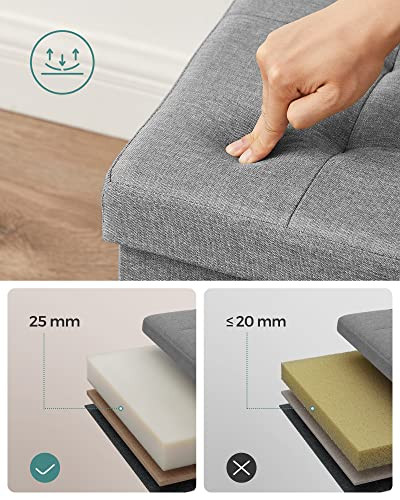 Bancuta hol cufar cu depozitare Songmics, gri, 76x38x38 cm, oferă un spațiu generos de depozitare de 80 de litri, ideal pentru organizarea plafoanelor, pernelor, jucăriilor și altor obiecte. Cu un design elegant și un sezut tapitat, este atât confortabil, cât și versatil, putând fi utilizată ca suport pentru pantofi, masă laterală sau scaun suplimentar. Fabricată din MDF robust (clasa E1), suportă până la 150 kg și se pliază cu ușurință pentru economisirea spațiului. Aspectul său atrăgător se integrează perfect în orice interior.