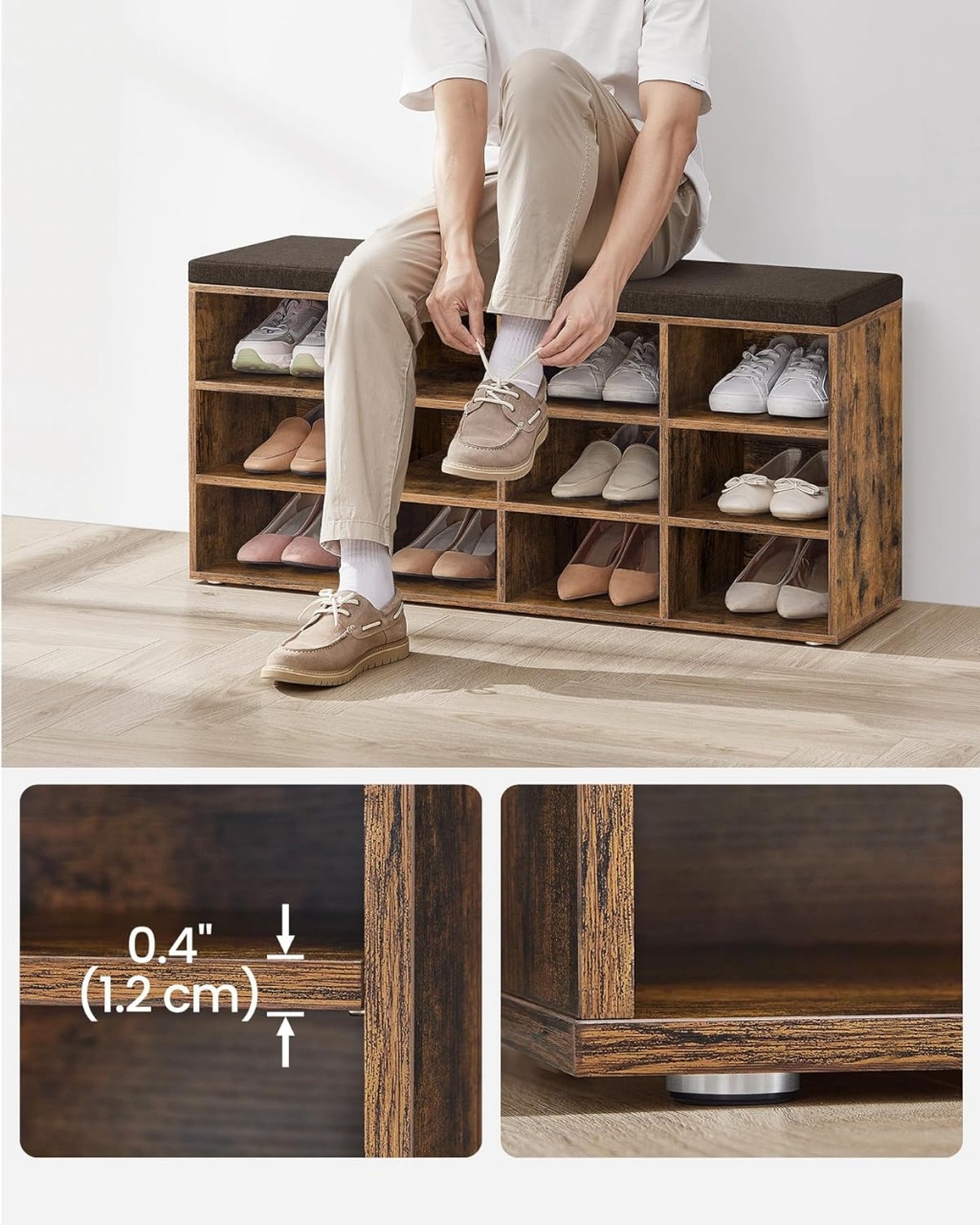 Bancuta hol cufar cu depozitare Vasagle, cu dimensiuni de 104x30.3x48 cm, este soluția perfectă pentru a pune capăt dezordinii. Aceasta dispune de 12 compartimente reglabile și detașabile, ideale pentru 12 perechi de pantofi. Realizată din Lemn PAL de 12 mm, suportă până la 136 kg și protejează podeaua cu cele 6 tampoane inferioare. Perna confortabilă, atașată cu carlige și bucle, are husa din tesatura cu fermoar lavabilă. Asamblarea este simplă, cu piese clar etichetate, iar designul versatil permite utilizarea în orice încăpere, aducând un plus de stil și funcționalitate.