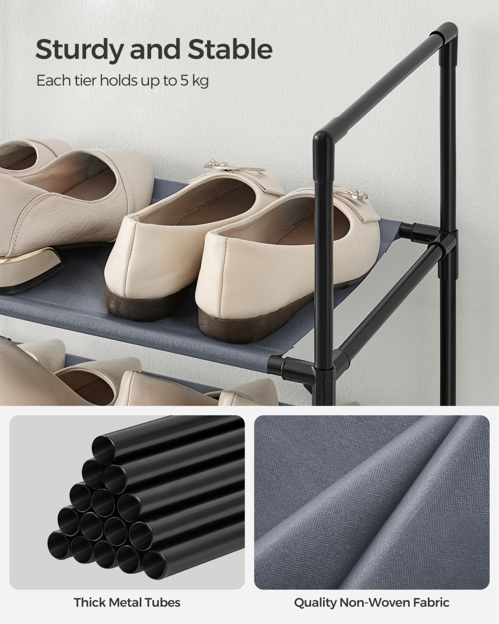 Pantofar modular Songmics 45x28x173 cm — Organizare spațioasă și optimizată Design modern și materiale de calitate Construit cu o siluetă îngustă și o combinație de materiale atent alese, acest pantofar aduce în casă o notă de rafinament și estetică modernă, fără a ocupa mult spațiu. Rama din oțel conferă robustețe și durabilitate, iar rafturile din material textil non-țesut adaugă o textură plăcută la atingere, creând astfel un ansamblu atât practic, cât și plăcut vizual. Datorită finisajului în nuanță de gri , pantofarul se integrează ușor în diverse amenajări, amplificând ambianța ordonată a holului sau dressingului tău. Funcționalitate și organizare Cu cele 10 niveluri și o înălțime inteligent dimensionată, pantofarul organizează eficient colecția familiei, astfel încât încălțămintea să fie mereu la îndemână și protejată de dezordine; acesta este ideal pentru cei care doresc un spațiu ordonat pentru întreaga familie. Poți separa modulul în două părți pentru utilizare în camere diferite sau poți omite câteva rafturi în timpul asamblării pentru a găzdui cizme înalte, oferind astfel o versatilitate remarcabilă și optimizare a spațiului. Designul spațios, dar compact, asigură o organizare clară a încălțămintei și o vizibilitate bună, ceea ce transformă gestionarea zilnică a pantofilor într-un proces simplu și plăcut. Montaj și întreținere Montajul este conceput pentru a fi lipsit de complicații, deoarece vei găsi instrucțiuni ilustrate ușor de urmat și piese etichetate numeric, ceea ce face instalarea rapidă și fără stres; astfel, îți recâștigi timpul pentru activitățile care contează cu adevărat. Întreținerea este la fel de simplă: șterge cadrul metalic cu o lavetă uscată și curăță suprafețele textile cu o cârpă umedă, pentru a păstra aspectul fresh și durabilitatea pe termen lung. Pentru siguranță, produsele includ un kit anti-răsturnare menit să asigure fixarea în perete, prevenind accidentele și sporind stabilitatea în gospodărie. Comandă acum Adaugă acum acest pantofar modular în casa ta pentru o organizare elegantă și eficientă — simplu, rapid și cu efect imediat. Detalii tehnice complete Dimensiuni și greutate Dimensiuni produs: 45 x 28 x 173 cm Greutate produs: 1.6 kg Capacitate maximă: 5 kg per nivel Materiale și caracteristici Material corp: Oțel robust și etajere din material textil non-țesut Culoare: Gri Montaj și pachet Stare asamblare: Neasamblat Conținut pachet: 1 x Pantofar, Accesorii de montaj, 2 x Kit anti-răsturnare, Instrucțiuni Stil și origine Stil: Modern Destinație recomandată: Hol, Dormitor, Living, Dressing Informații importante Copiii nu trebuie să se urce sau să se joace pe pantofar din motive de siguranță, iar pentru stabilitate este recomandat să fijați organizatorul de perete folosind kitul anti-răsturnare inclus. Respectați instrucțiunile de asamblare și avertismentele din manual pentru a asigura o utilizare sigură și durabilă a produsului.