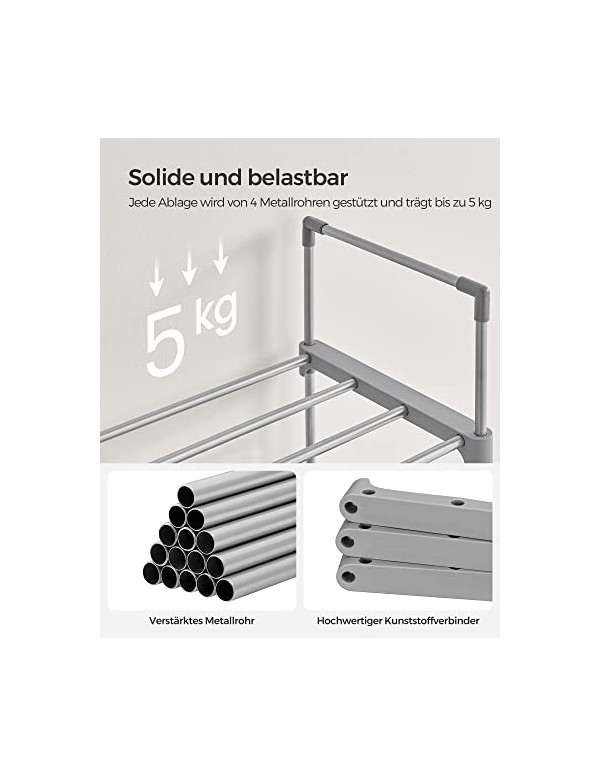 Pantofarul Songmics, în nuanța gri elegant, este soluția perfectă pentru organizarea încălțămintei tale. Cu dimensiuni de 45 x 30 x 174 cm și o greutate de doar 3.1 kg, acest suport pentru încălțăminte are capacitatea de a susține până la 20 de perechi de pantofi, oferind 10 niveluri de stocare. Fabricat din metal durabil, este dotat cu un kit anti-răsturnat pentru siguranță suplimentară. Pachetul include instrucțiuni în mai multe limbi, facilitând montajul rapid și ușor. Transformă-ți spațiul cu acest pantofar functional și stilat!
