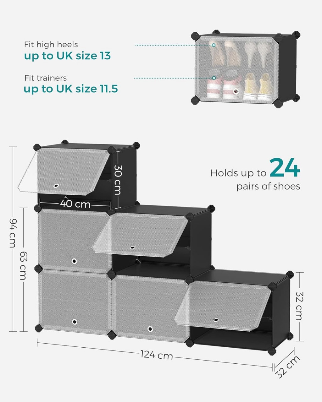[Mult spatiu] Acest organizator din plastic pentru depozitarea pantofilor, capabil sa tina pana la 24 de perechi de pantofi, poate fi folosit si pentru a depozita genti si haine. Cu carligele sale laterale care economisesc spatiu, este o modalitate convenabila de a agata palarii sau lese de caine [Robust si sigur] Fabricat cu conectori de inalta calitate, panouri din plastic si sarma de otel robusta, fiecare compartiment al acestui dulap de pantofi suporta pana la 5 kg. Kitul anti-inclinare inclus sporeste siguranta pentru utilizarea in camere de zi sau dormitoare [Asamblare si dezasamblare usoara] Ciocanul de cauciuc inclus face ca asamblarea acestui dulap de pantofi sa fie rapida si usoara. Acest organizator poate fi, de asemenea, dezasamblat rapid pentru a fi depozitat sau transportat, permitandu-va sa il rearanjati cu usurinta prin casa [Adaptabil si versatil] Configurati aceasta unitate de depozitare in diferite moduri. Faceti-o sa aiba 2 sau 3 randuri separate, sau chiar impartiti-o in 2 rafturi mici pentru a organiza pantofii, hainele sau articolele de toaleta in hol, baie sau orice alt spatiu dorit [Aerisit si usor de curatat] Acest dulap de pantofi din plastic este prevazut cu usi transparente, oferind protectie impotriva prafului si a apei, permitand in acelasi timp o vizualizare usoara a pantofilor din interior. Ochelarii de pe usi permit deschiderea fara efort si promoveaza ventilatia
