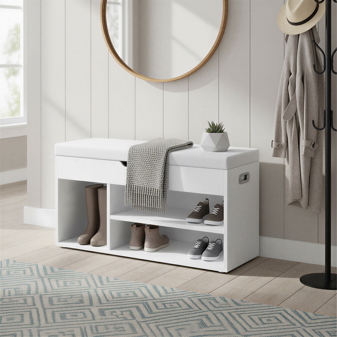 Pantofar tip băncuță cu depozitare Vasagle, dimensiuni 80 x 30.3 x 44 cm, oferă o soluție elegantă și practică pentru organizarea spațiului. Designul său modern, cu finisaj alb, se integrează perfect în orice hol sau dormitor. Realizat din panouri solide de PAL și dotat cu o pernă din piele ecologică, acest pantofar asigură confort și estetică premium. Compartimentul ascuns sub șezut permite depozitarea discretă a obiectelor, iar rafturile deschise pot găzdui până la 7 perechi de încălțăminte. Montajul este rapid și intuitiv, iar întreținerea se face ușor, păstrându-l ca nou.