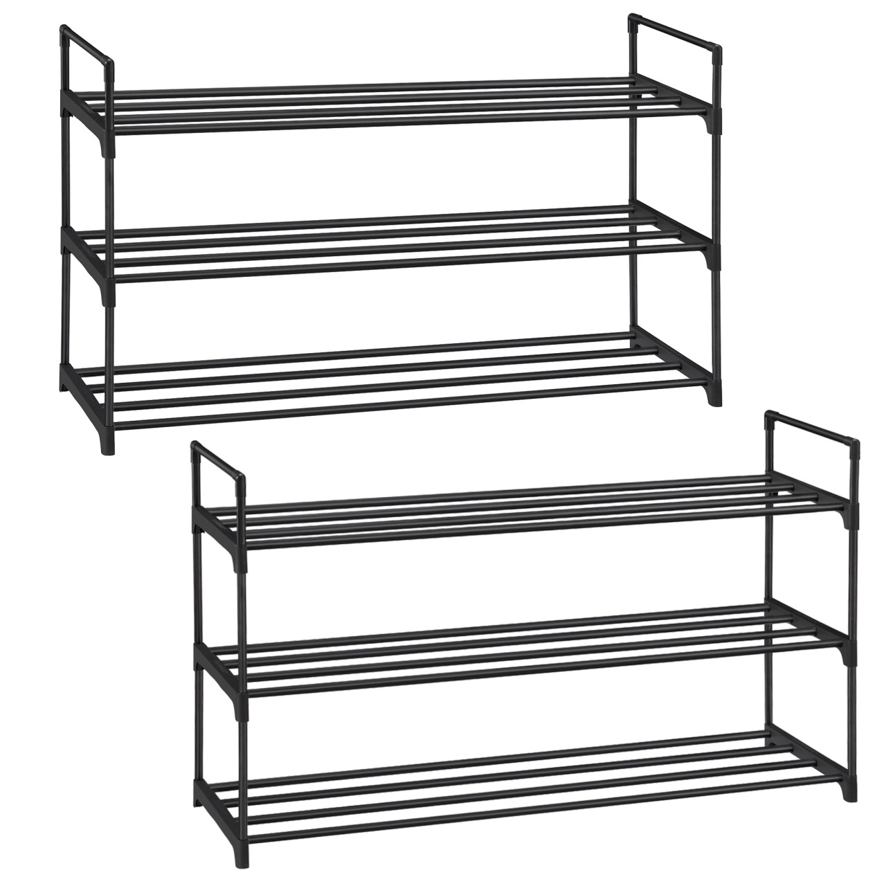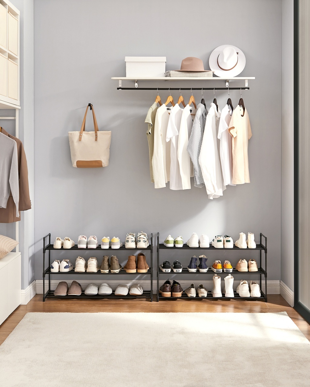 Setul de 2 buc. pantofare modulare Songmics, cu dimensiuni de 92x30x54 cm, oferă o soluție elegantă pentru organizarea încălțămintei. Designul modern, cu finisaj negru discret, se integrează armonios în orice decor, aducând un plus de rafinament. Fiecare unitate dispune de trei niveluri, având capacitatea de a susține până la 12 perechi de pantofi pentru bărbați sau 15 pentru femei. Montajul este rapid și intuitiv, iar întreținerea se face ușor cu o cârpă umedă. Alege acest set pentru a transforma haosul într-o ordine practică și stilată!