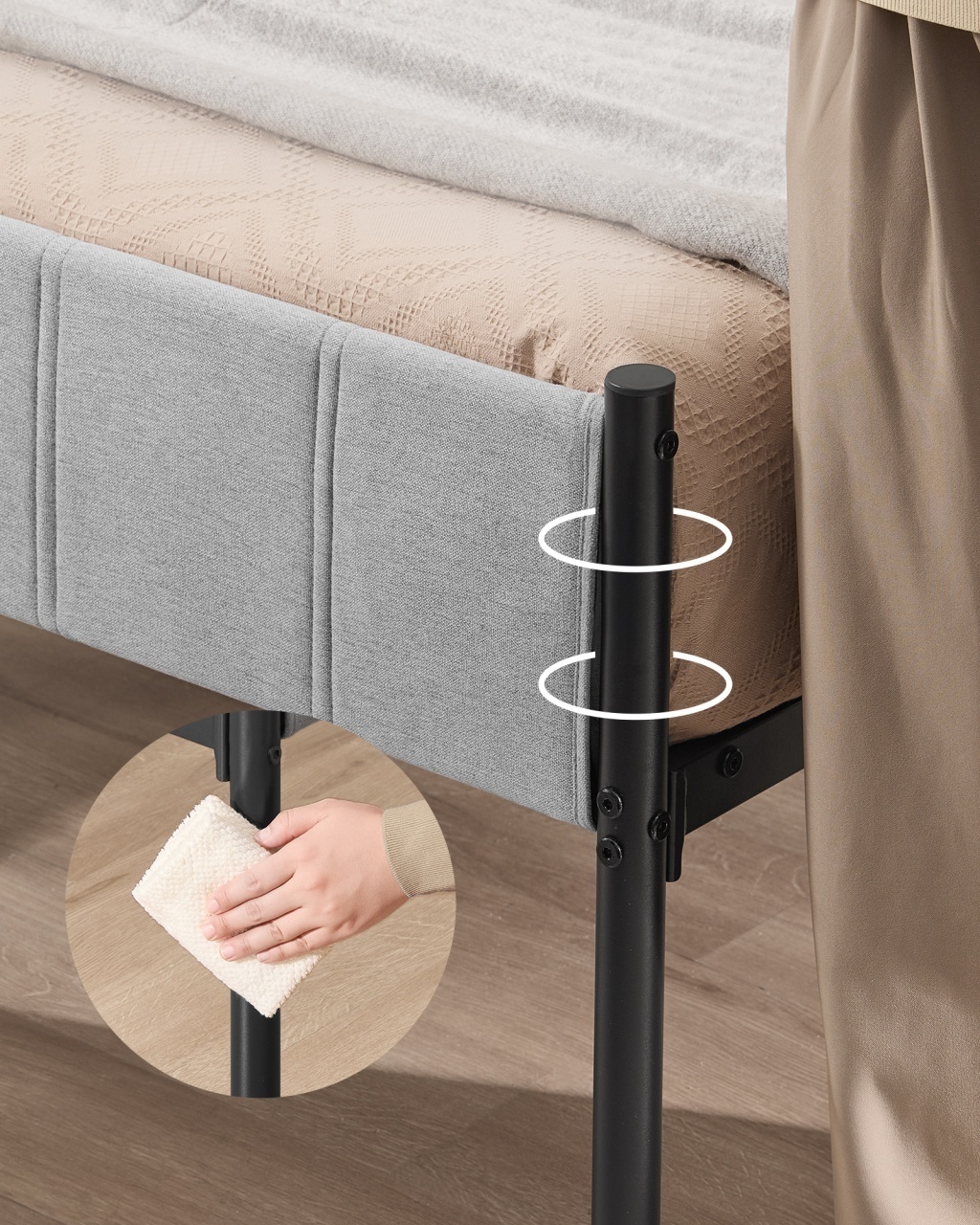 Cadru de pat Vasagle 207x161.5x104 cm — Confort elegant și susținere robustă Design modern și materiale de calitate Construit pentru a îmbina simplitatea contemporană cu o prezență discretă, acest cadru de pat se evidențiază prin linii minimaliste și muchii rotunjite care aduc atât siguranță, cât și o estetică rafinată în dormitorul tău. Tapițeria din poliester, combinată cu buretele de densitate 24D la tăblie, oferă o senzație plăcută la atingere și transformă spătarul într-un punct confortabil pentru citit sau pentru momentele de relaxare, astfel conferind o notă de ambianță premium. Materialele alese garantează durabilitate , confort și estetică , aducând o soluție vizuală și tactilă de calitate pentru orice decor. Funcționalitate și organizare Structura din oțel vopsit și cele 9 picioare robuste asigură o susținere stabilă, astfel încât patul rămâne silențios și ferm în utilizare, chiar și la sarcini mari de până la 500 kg; această performanță face produsul potrivit pentru familii sau dormitoare care cer rezistență în timp. Distanța de 31 cm față de podea oferă un spațiu util pentru cutii de depozitare și pentru aspiratorul robot, optimizând astfel fiecare centimetru din cameră și facilitând ordinea în casa ta. Prin compartimentarea implicită a spațiului sub pat, acest cadru oferă versatilitate , spațios și optimizare practică a locuinței. Montaj și întreținere Construcția simplă și instrucțiunile ușor de urmărit fac ca montajul să fie rapid și eficient, astfel încât patul este gata de utilizare în scurt timp, fără complicații inutile. Suprafețele metalice vopsite se curăță ușor cu o cârpă moale și un detergent delicat, iar tapițeria din poliester poate fi întreținută prin aspirare periodică pentru a păstra aspectul ca nou; aceste recomandări asigură durabilitate , ușurință în întreținere și siguranță . Pentru stabilitate suplimentară și protecție la utilizare, este recomandată fixarea suplimentară pe perete cu ajutorul unui sistem de fixare în perete disponibil separat. Comandă acum Adaugă în coș acum și transformă dormitorul într-un spațiu confortabil, stabil și plin de rafinament. Detalii tehnice complete Dimensiuni și greutate Dimensiuni produs: 207 x 161.5 x 104 cm Greutate produs: 18.9 kg Capacitate maximă: 500 kg Materiale și caracteristici Material corp: Oțel vopsit și structuri suport; elemente tapițate cu burete la tăblie Material tapițerie/finisaj: Țesătură din poliester și burete (24D) Culoare: Gri deschis Montaj și pachet Stare asamblare: Neasamblat Conținut pachet: 1 x Cadru de pat, 1 x Accesorii de montaj, 1 x Manual de asamblare Stil și origine Stil: Minimalist Destinație recomandată: Dormitor