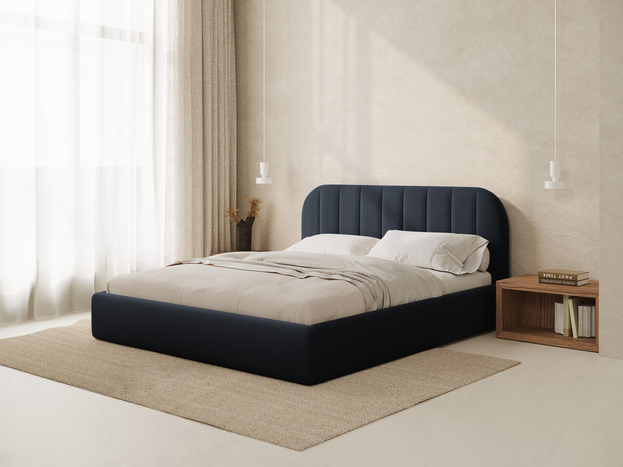 Pat tapitat cu somiera rabatabila si lada depozitare 200x200 cm Windsor & Co Juno catifea albastru inchis