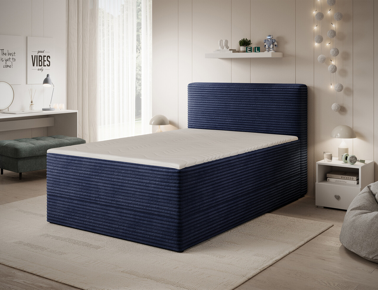 Pat continental tapitat cu lada depozitare 120x200 cm ELTAP Alamito lemn/poliester albastru inchis