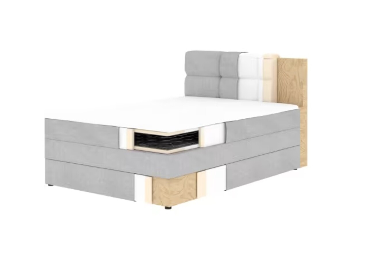 Patul continental Kasped este o alegere moderna si functionala pentru orice dormitor, disponibil in doua dimensiuni: 215x121x108 cm si 215x141x108 cm, ceea ce permite adaptarea sa la nevoile individuale si la dimensiunile incaperii. Constructia patului se bazeaza pe un cadru solid din lemn masiv si PAL, asigurand stabilitate si durabilitate pe termen lung. Elementul central al confortului este salteaua cu arcuri Bonell, fixata permanent in cadru care datorita arcurilor Bonell ofera un suport eficient corpului si asigura conditii ergonomice de somn si o buna circulatie a aerului. In plus, patul este echipat cu doua straturi de spuma de inalta calitate – spuma T2130 si spuma T2540 – care, in combinatie cu arcurile, sporesc flexibilitatea si confortul de utilizare, adaptandu-se formei corpului si oferind un somn sanatos si odihnitor. Intregul design este realizat intr-un stil modern, cu linii drepte si o forma eleganta, completat de picioare negre din plastic rezistent – nu doar stabile, ci si estetice. Un element extrem de practic este lada de depozitare pentru lenjerie care permite stocarea comoda a pilotelor, pernelor sau a altor textile, contribuind la mentinerea ordinii in dormitor. Patul Kasped imbina calitatea ridicata a executiei, estetica si functionalitatea, fiind o alegere excelenta atat pentru interioarele moderne, cat si pentru cele clasice.Compozitie materialMaterial tapiterie: 100% poliester (tesatura primara Paolli 18).Material cadru: lemn de pinUmplutura sezut: spuma T2130, unitate de arcuri Bonell, spuma T2540Grosime topper: 5 cmUmplutura spatar: spuma T2130Picioare din plastic de culoare neagra.Informatii si dimensiuni specificeInaltime sezut: 62.5 cmInaltime picioare: 1.5 cmGreutatea maxima suportata: 200 kgCompartiment depozitare: 1Dimensiuni compartiment depozitare: 120x116x19 cmSuprafata de dormit: 120x200 cmProdusul necesita asamblare.