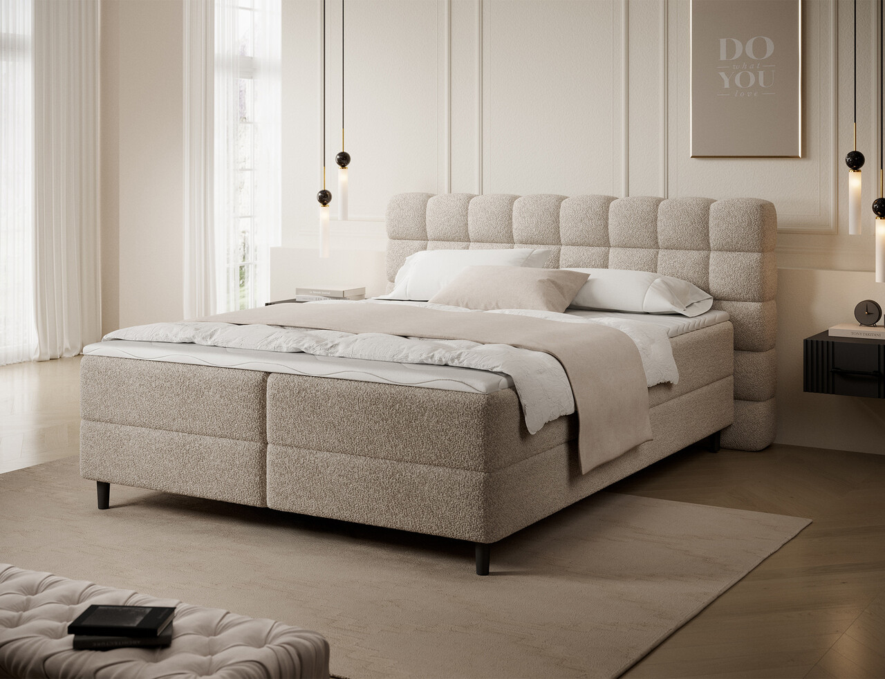 Patul continental Camma imbina designul modern, functionalitatea si confortul somnului, fiind alegerea perfecta pentru un dormitor elegant si practic. Disponibil in trei variante de dimensiuni – 140x200 cm, 160x200 cm si 180x200 cm – permite o adaptare ideala la spatiu si la nevoile utilizatorilor, iar constructia solida, cu o inaltime totala de 102 cm si o inaltime a sezutului de 56 cm, asigura confortul zilnic; lungimea patului este de 222 cm, iar latimea variaza in functie de model – 162 cm, 182 cm sau 202 cm – oferind un aspect stabil si masiv care subliniaza caracterul prestigios al interiorului. Tapitat cu o tesatura de inalta calitate, placuta la atingere, se remarca prin tablia estetica cu matlasare eleganta, adaugand o nota de eleganta moderna si oferind un sprijin ideal pentru momentele de relaxare de seara. Lada de depozitare practica pentru lenjeria de pat ajuta la mentinerea ordinii in dormitor si la utilizarea optima a spatiului, ceea ce face ca patul Camma sa fie nu doar confortabil, ci si extrem de functional. Intregul ansamblu este completat de picioare negre din lemn, cu o inaltime de 10 cm care ofera lejeritate constructiei si faciliteaza curatenia sub pat. Modelul Camma este alegerea ideala pentru cei care apreciaza stilul modern, eleganta, durabilitatea si confortul, garantand un somn sanatos si linistit in fiecare zi.Compozitie materialMaterial tapiterie: 100% poliester (tesatura primara Royal 18).Material cadru: lemn de pinUmplutura sezut: spuma T2540Grosime topper: 4 cmUmplutura spatar: spuma T2130Picioare din lemn de culoare neagra.Informatii si dimensiuni specificeInaltime sezut: 56 cmInaltime picioare: 10 cmGreutatea maxima suportata: 220 kgCompartiment depozitare: 2Dimensiuni compartiment depozitare: 182x66x15 cmSuprafata de dormit: 140x200 cmProdusul necesita asamblare.