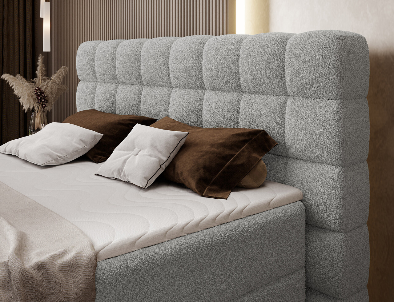 Pat continental tapitat cu lada depozitare 160x200 cm ELTAP Camma lemn/poliester gri deschis