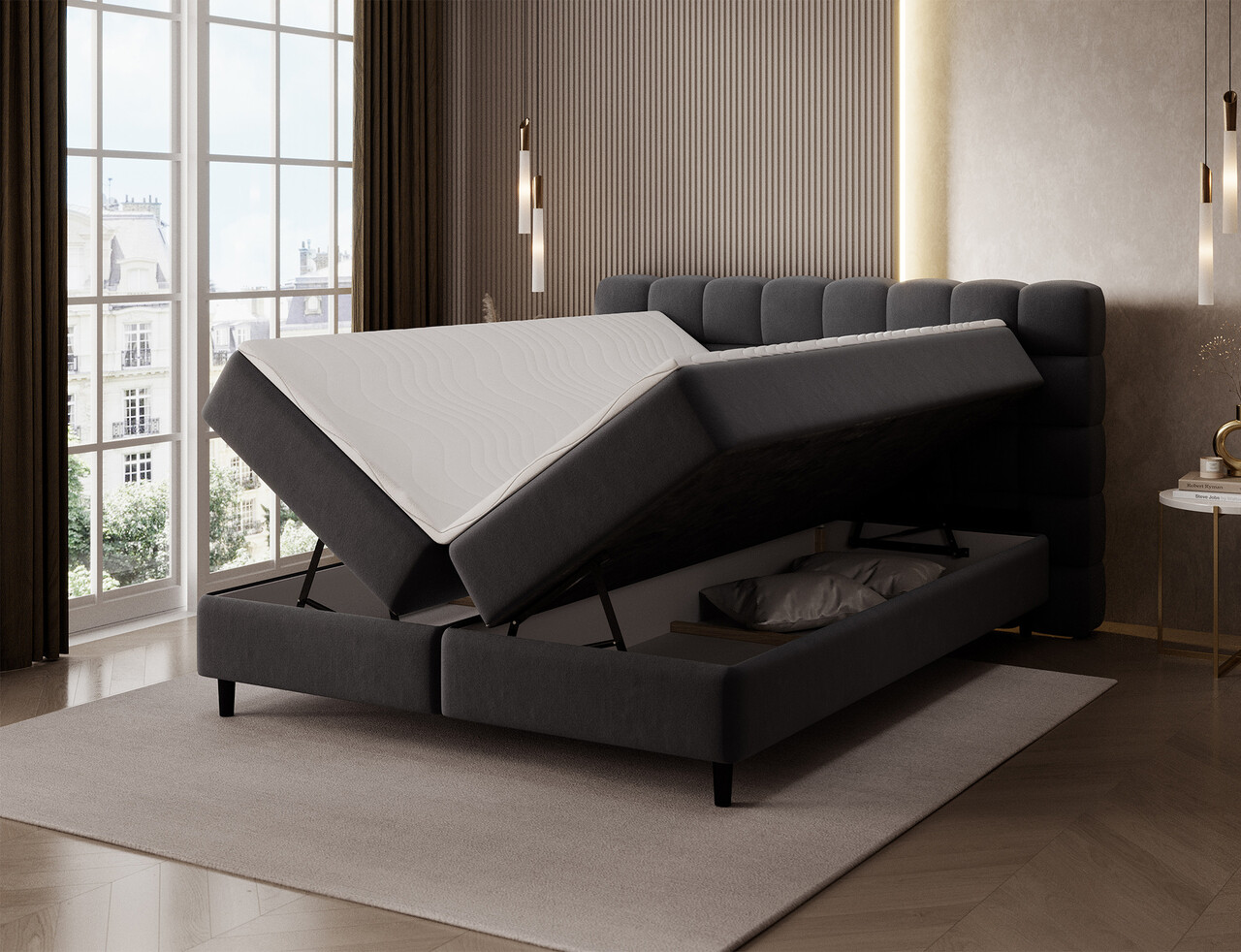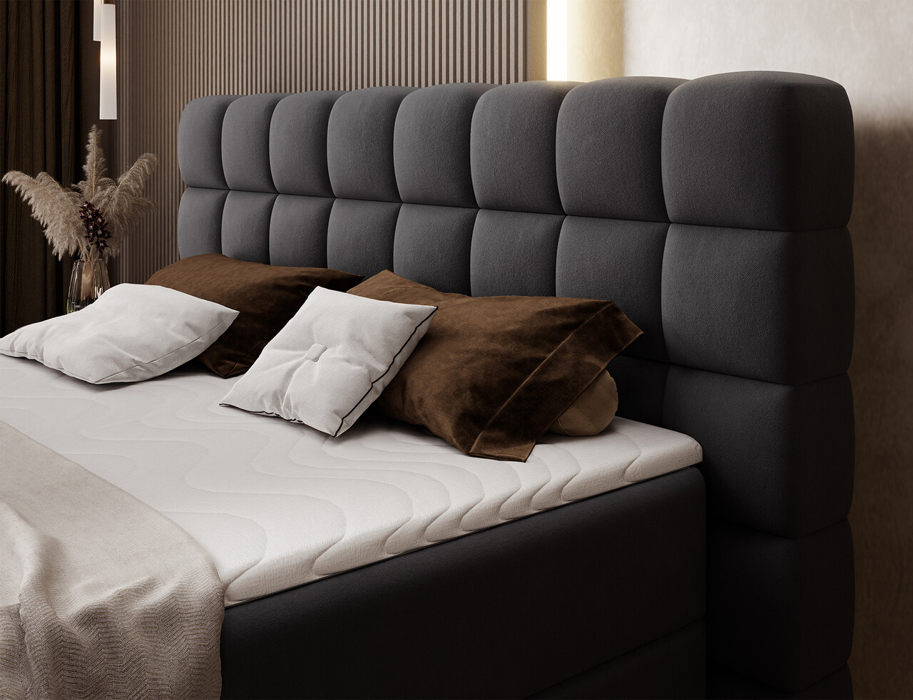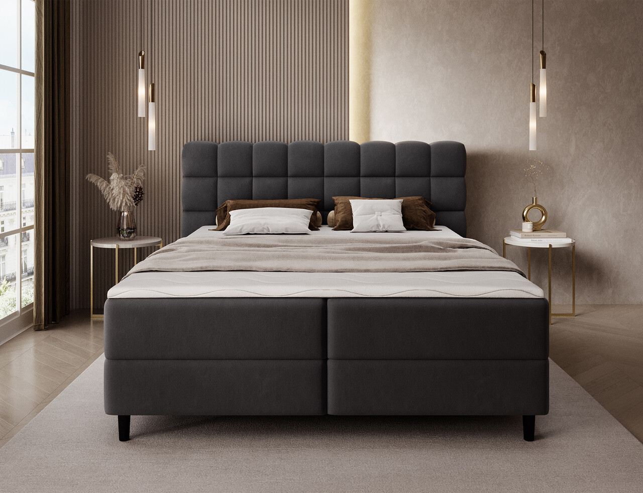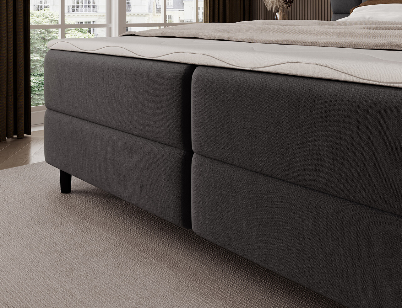 Patul continental Camma imbina designul modern, functionalitatea si confortul somnului, fiind alegerea perfecta pentru un dormitor elegant si practic. Disponibil in trei variante de dimensiuni – 140x200 cm, 160x200 cm si 180x200 cm – permite o adaptare ideala la spatiu si la nevoile utilizatorilor, iar constructia solida, cu o inaltime totala de 102 cm si o inaltime a sezutului de 56 cm, asigura confortul zilnic; lungimea patului este de 222 cm, iar latimea variaza in functie de model – 162 cm, 182 cm sau 202 cm – oferind un aspect stabil si masiv care subliniaza caracterul prestigios al interiorului. Tapitat cu o tesatura de inalta calitate, placuta la atingere, se remarca prin tablia estetica cu matlasare eleganta, adaugand o nota de eleganta moderna si oferind un sprijin ideal pentru momentele de relaxare de seara. Lada de depozitare practica pentru lenjeria de pat ajuta la mentinerea ordinii in dormitor si la utilizarea optima a spatiului, ceea ce face ca patul Camma sa fie nu doar confortabil, ci si extrem de functional. Intregul ansamblu este completat de picioare negre din lemn, cu o inaltime de 10 cm care ofera lejeritate constructiei si faciliteaza curatenia sub pat. Modelul Camma este alegerea ideala pentru cei care apreciaza stilul modern, eleganta, durabilitatea si confortul, garantand un somn sanatos si linistit in fiecare zi.Compozitie materialMaterial tapiterie: 100% poliester (tesatura primara Lukso 10).Material cadru: lemn de pinUmplutura sezut: spuma T2540Grosime topper: 4 cmUmplutura spatar: spuma T2130Picioare din lemn de culoare neagra.Informatii si dimensiuni specificeInaltime sezut: 56 cmInaltime picioare: 10 cmGreutatea maxima suportata: 240 kgCompartiment depozitare: 2Dimensiuni compartiment depozitare: 182x76x15 cmSuprafata de dormit: 160x200 cmProdusul necesita asamblare.
