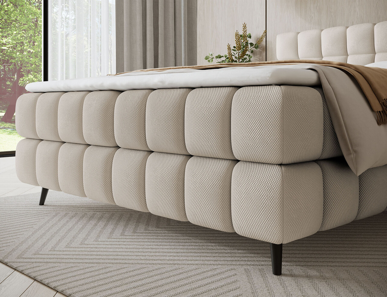 Patul continental Sabeno este o alegere eleganta si functionala pentru orice dormitor modern. Modelul este disponibil in trei variante de dimensiuni: 140x200 cm, 160x200 cm si 180x200 cm, permitandu-va sa ajustati latimea patului in functie de nevoile individuale. Inaltimea totala a structurii este de 111 cm, iar lungimea de 222 cm, oferind patului un aspect stabil si impunator. Confortul in timpul somnului este asigurat de combinatia dintre arcurile Bonell si spuma T2540 care ofera sustinere adecvata si durabilitate. Patul Sabeno este echipat cu un compartiment practic pentru depozitarea lenjeriei care ajuta la mentinerea ordinii in dormitor. Picioarele negre din lemn completeaza designul, adaugand eleganta subtila si lejeritate. Stilul modern al patului Sabeno il face sa se potriveasca perfect atat in interioare minimaliste, cat si in amenajari mai expresive. Datorita functionalitatii, materialelor de inalta calitate si finisajului estetic, patul continental Sabeno este alegerea ideala pentru cei care apreciaza confortul, durabilitatea si mobilierul de dormitor stilat.Compozitie materialMaterial tapiterie: 100% poliester (tesatura primara Calmora 18).Material cadru: lemn de pinUmplutura sezut: spuma T2540 si arcuri BonellGrosime topper: 5 cmUmplutura spatar: spuma T2130Picioare din lemn de culoare neagra.Informatii si dimensiuni specificeInaltime sezut: 56 cmInaltime picioare: 11 cmGreutatea maxima suportata: 240 kgCompartiment depozitare: 2Dimensiuni compartiment depozitare: 196x72x20 cmSuprafata de dormit: 160x200 cmProdusul necesita asamblare.