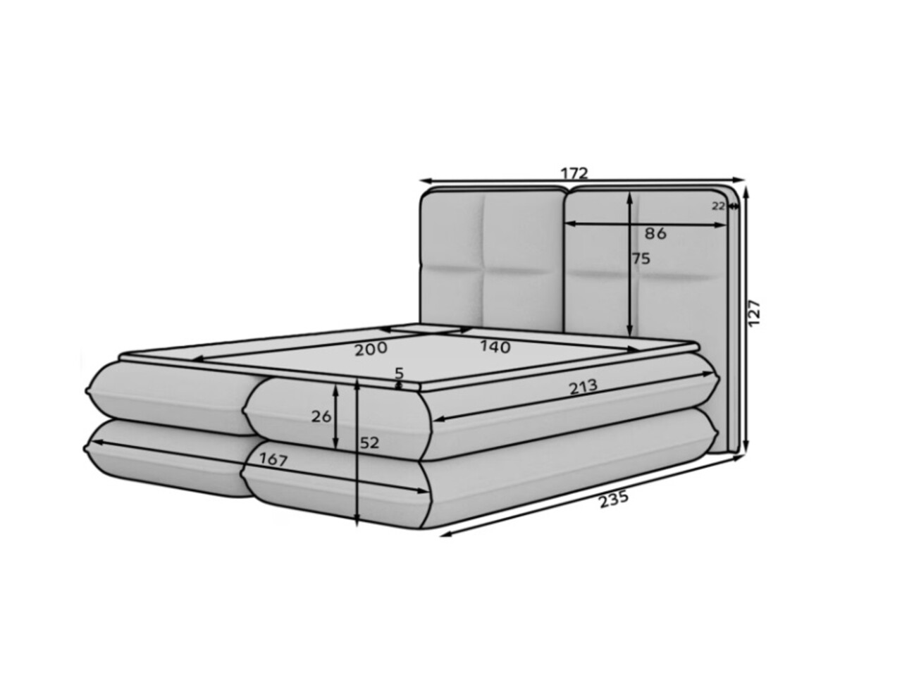 Patul Tonila este un pat tapitat modern si functional care imbina confortul somnului cu solutii practice pentru dormitor, fiind ideal atat pentru amenajari moderne, cat si clasice. Constructia solida, cu o inaltime de 127 cm si o lungime de 235 cm, asigura stabilitate si un sprijin confortabil, iar umplutura utilizata: spuma T2130 (lada de depozitare), arcuri bonell si spuma T2540 cu grosimea de 2.5 cm garanteaza sustinerea corecta a corpului si un nivel ridicat de confort in utilizarea zilnica. Patul este dotat cu un spatiu practic de depozitare pentru lenjerie care faciliteaza organizarea si mentinerea ordinii in dormitor, iar aspectul este completat de picioare de mobilier negre, ce confera structurii un caracter modern si aerisit. Modelul Tonila este disponibil in trei dimensiuni populare: 140x200 cm, 160x200 cm si 180x200 cm, permitand adaptarea usoara la dimensiunea incaperii si la nevoile individuale, oferind un pat confortabil care combina estetica, durabilitatea si functionalitatea.Compozitie materialMaterial tapiterie: 100% poliester (tesatura primara Calmora 04).Material cadru: lemn de pinUmplutura sezut: arcuri Bonell si spuma T2540Umplutura cadru: spuma T2130Grosime topper: 5 cmUmplutura spatar: spuma T2130Picioare din plastic de culoare neagra.Informatii si dimensiuni specificeInaltime sezut: 52 cmInaltime picioare: 2.5 cmGreutatea maxima suportata: 220 kgCompartiment depozitare: 2Dimensiuni compartiment depozitare: 196x66x23 cmSuprafata de dormit: 140x200 cmProdusul necesita asamblare.