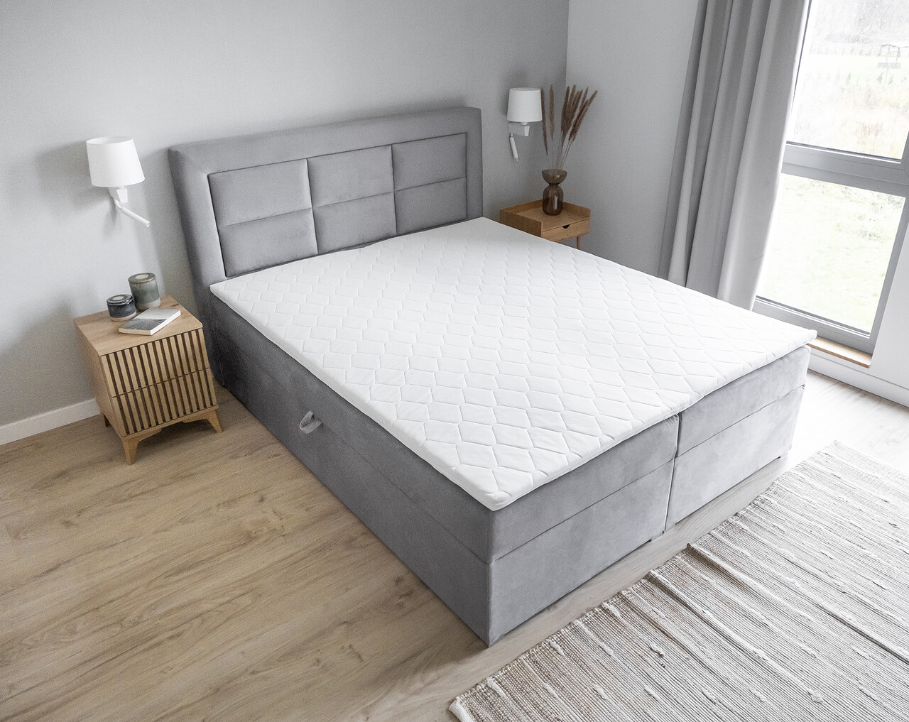 Vivre este un pat boxspring simplu si spatios, dar elegant si foarte confortabil care va fi finisajul perfect pentru orice aranjament modern al unei camere de dormitor. Acest model, care poate fi selectat in trei dimensiuni: 140/160/180 x 200 cm, este echipat cu o spuma solida saltea Bonell si T25. In plus, merita, de asemenea, sa aruncati o privire la cele doua compartimente de depozitare spatioase pentru asternuturi. Elementele caracteristice suplimentare ale patului Vivre includ: o tablie la moda, cusaturi, un sezut inalt de 53 cm, precum si picioare mici. Daca esti interesat de un pat confortabil si elegant din care sa te ridici doar cu piciorul drept, datorita confortului si functionalitatii maxime pe care le ofera - te invitam sa te interesezi de Vivre Boxspring. La urma urmei, somnul sanatos este cel mai important lucru.Compozitie materialMaterial tapiterie: 100% poliester (tesatura primara Monolith 84).Material cadru: lemn de pinUmplutura sezut: Bonell si spuma T25Picioare din plastic de culoare argintie.Informatii si dimensiuni specificeInaltime sezut: 53 cmInaltime picioare: 2 cmGreutatea maxima suportata: 170 kgCompartiment depozitare: 2Suprafata de dormit: 140x200 cmProdusul necesita asamblare, asamblat partial.