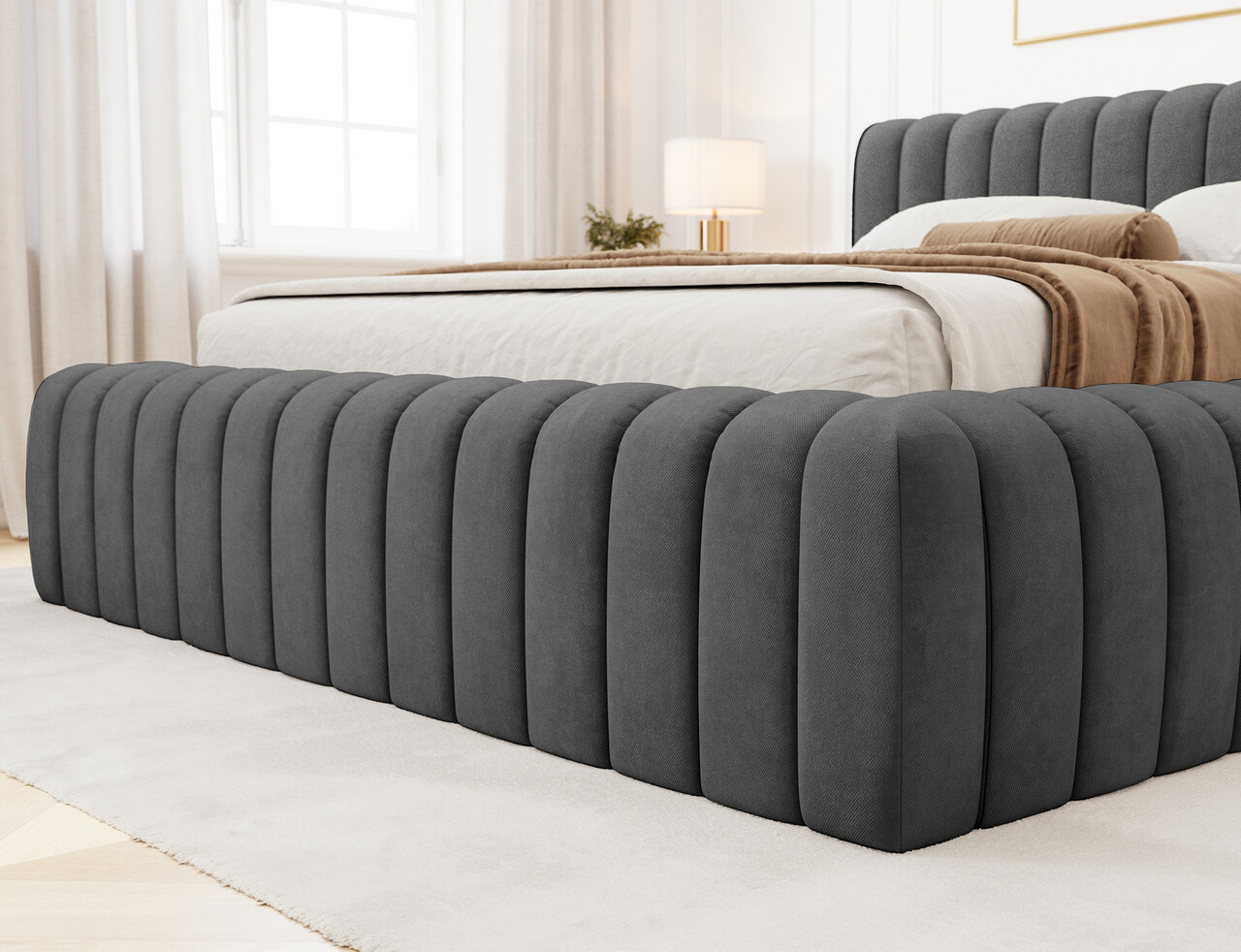 Patul Carilla este o piesa de mobilier moderna si eleganta, disponibila in trei dimensiuni: 140x200 cm, 160x200 cm si 180x200 cm, integrandu-se perfect in tendintele interioarelor contemporane. Confortul utilizarii este asigurat de umplutura ramei si a tetierei cu spuma poliuretanica de inalta calitate T2130 si T2315, garantand durabilitate si confort. Constructia sa solida se bazeaza pe un cadru metalic cu 36 de lamele, oferind un suport excelent pentru saltea si un somn odihnitor. Intregul ansamblu este completat de un glisor negru care evidentiaza stabilitatea si estetica piesei de mobilier.Compozitie materialMaterial tapiterie: 100% poliester (tesatura primara Sola 06).Material cadru: metalUmplutura cadru: spuma poliuretanica T2130 si spuma T2315Umplutura spatar: spuma poliuretanica T2130 si spuma T2315Picioare din plastic de culoare neagra.Informatii si dimensiuni specificeInaltime sezut: 42 cmInaltime picioare: 2 cmGreutatea maxima suportata: 240 kgDimensiuni lada depozitare: 140x200x19 cmSomiera rabatabila cu piston pe gazNumar lamele: 36Suprafata de dormit: 140x200 cmProdusul necesita asamblare.