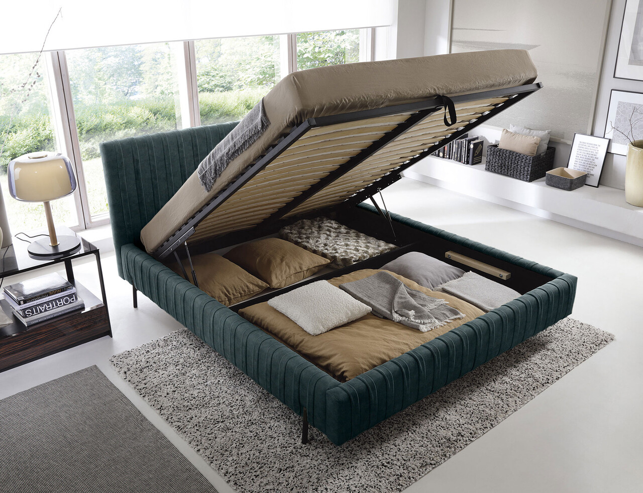 Pat tapitat cu somiera rabatabila si lada depozitare 140x200 cm ELTAP Plissa metal/poliester verde
