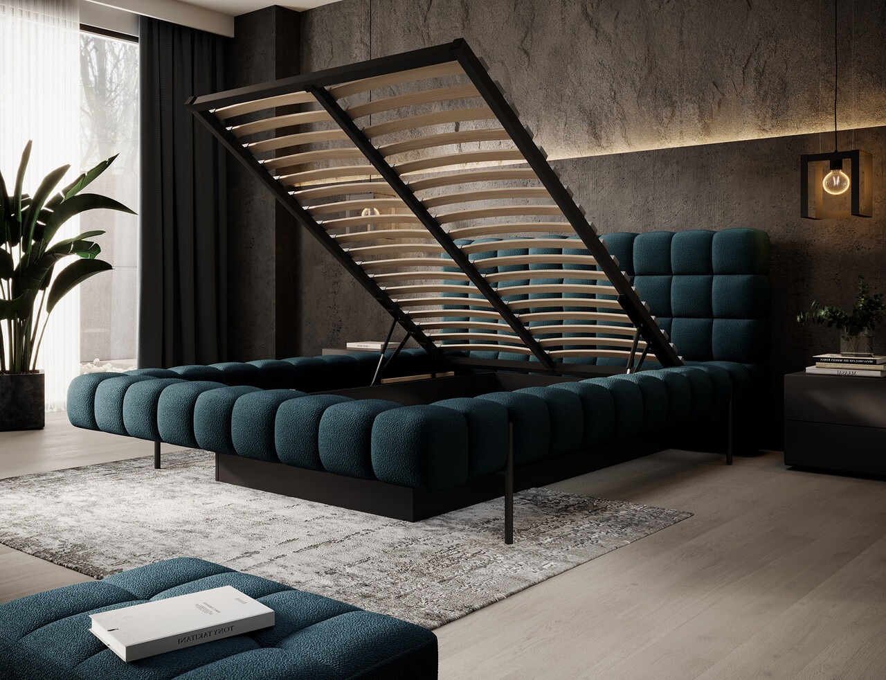 Patul Magentta reprezinta o combinatie de design modern, functionalitate si confort deosebit. Datorita spatarului tapitat, patul are un aspect extrem de elegant si adauga o nota de caldura oricarui dormitor. Structura solida si spatarul umplut cu spuma T2130 ofera un suport excelent si confort atat pentru somn, cat si pentru relaxare. Modelul este disponibil in trei dimensiuni: 140 cm, 160 cm si 180 cm, permitand adaptarea acestuia la dimensiunea camerei si la preferintele individuale. Cadrul metalic include 36 de lamele care sustin uniform salteaua, sporind durabilitatea constructiei si confortul utilizarii. Piciorul negru din metal ofera o baza solida si accentueaza caracterul minimalist si modern al patului. Un avantaj suplimentar este lada de depozitare pentru lenjerie care permite stocarea practica a pilotelor, pernelor sau altor textile, economisind spatiu in camera. Patul Magentta este alegerea ideala pentru cei care apreciaza stilul modern, confortul si solutiile functionale.Compozitie materialMaterial tapiterie: 100% poliester (tesatura primara Amore 40).Material cadru: metalUmplutura cadru: spuma T2130Umplutura spatar: spuma T2130Picioare din metal de culoare neagra.Informatii si dimensiuni specificeInaltime sezut: 44 cmInaltime picioare: 21 cmGreutatea maxima suportata: 250 kgDimensiuni lada depozitare: 177x120x29 cmSomiera rabatabila cu piston pe gazNumar lamele: 36Suprafata de dormit: 160x200 cmProdusul necesita asamblare, asamblat partial.