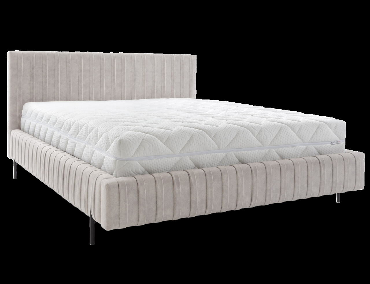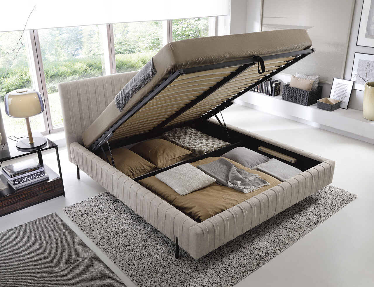 Pat tapitat cu somiera rabatabila si lada depozitare 160x200 cm ELTAP Plissa metal/poliester bej deschis