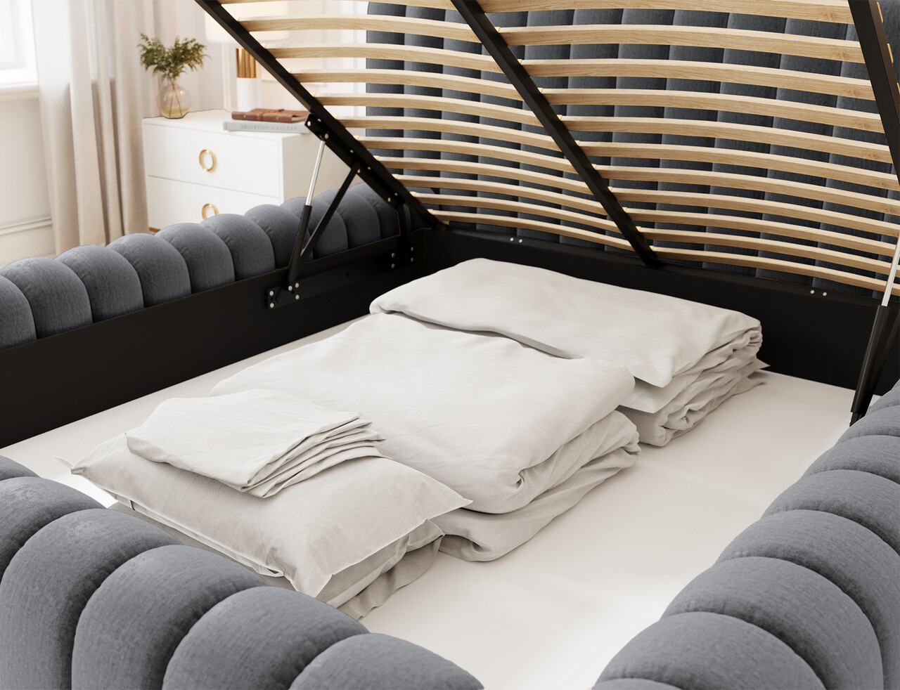 Pat tapitat cu somiera rabatabila si lada depozitare 180x200 cm ELTAP 97MO-1.8 Carilla metal/poliester gri inchis