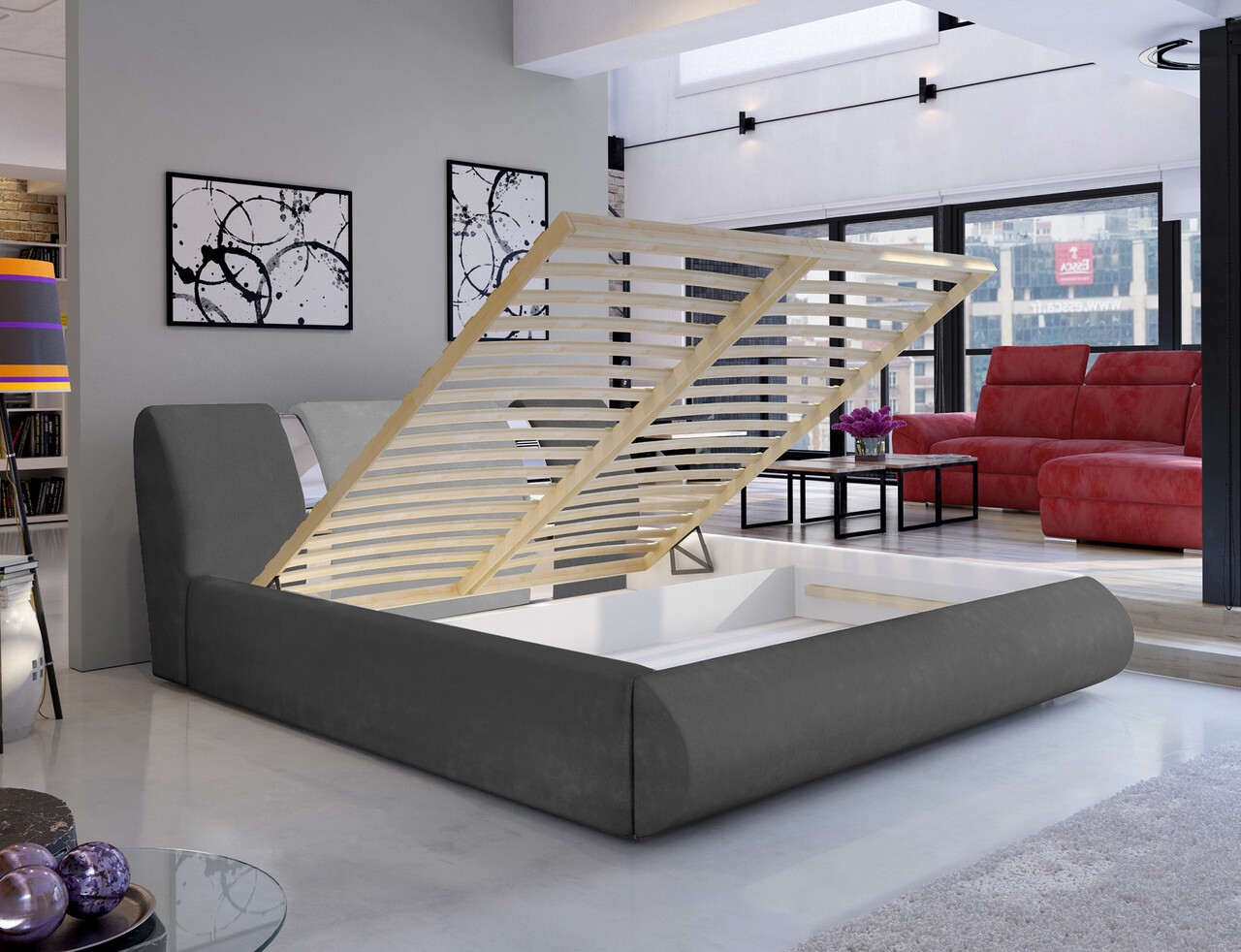Pat tapitat cu somiera si lada depozitare 140x200 cm ELTAP Flavio lemn/poliester gri inchis/gri deschis