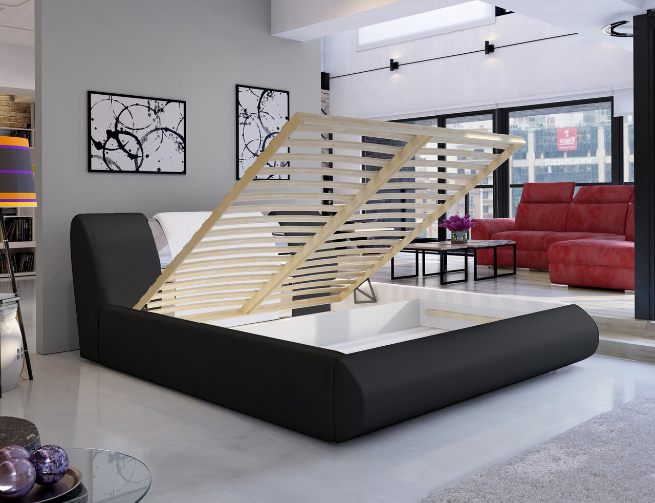 Pat tapitat cu somiera si lada depozitare 160x200 cm ELTAP Flavio lemn/poliester negru/alb