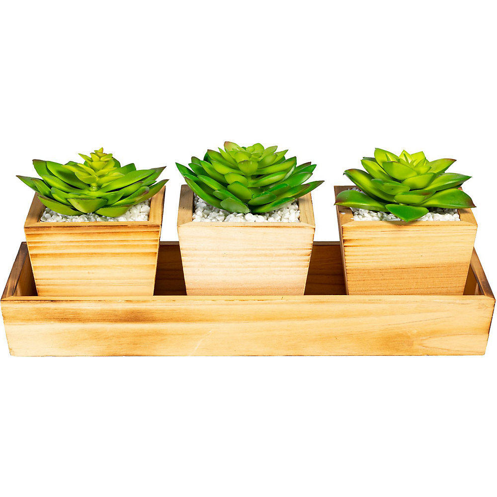 Aranjamentul de plante suculente pe tavă de lemn este compus din 2 bucăți și are dimensiunile 320 x 120 x 40 mm. Este decorat cu pietriș, iar aspectul său natural și elegant îl face perfect pentru a aduce un strop de verdeață în orice încăpere. Ideal pentru a fi folosit ca decor pentru birou, living sau chiar balcon. Un cadou minunat pentru cei care apreciază frumusețea plantelor suculente.