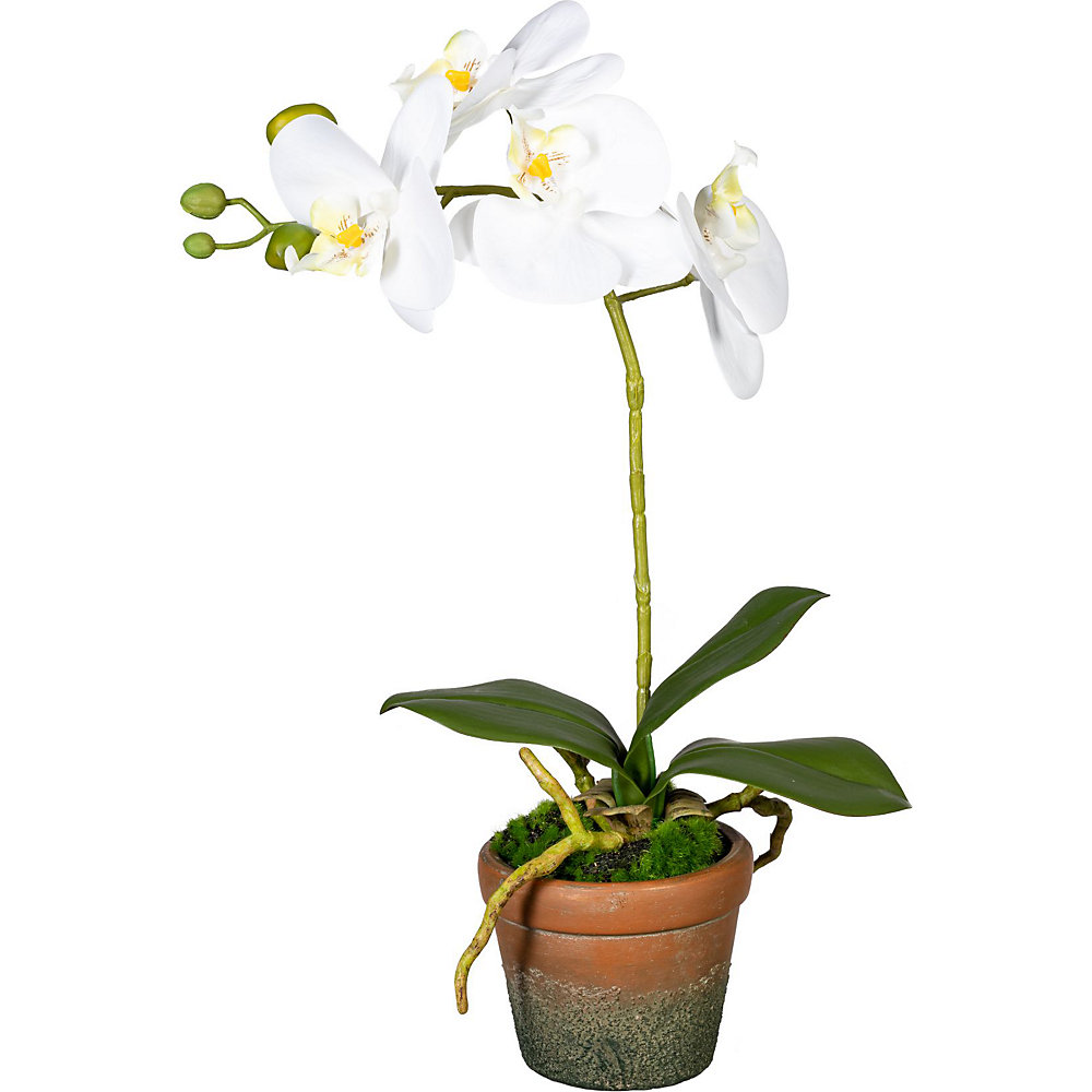 Orhidee Phalaenopsis real touch este o planta decorativa cu flori albe, ambalata in ghiveci din teracota. Este o solutie ideala pentru a aduce un strop de natura in casa ta, avand un aspect natural si proaspat. Poti avea o atmosfera relaxanta si reconfortanta oriunde o amplasezi.