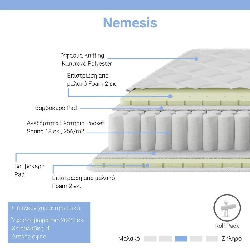Descoperă confortul suprem cu Salteaua Nemesis Pako World 2 fețe Aloe Vera! Cu o înălțime de 20-22 cm și dimensiuni de 90x190 cm, această saltea beneficiază de tehnologia avansată cu arcuri pocket spring independente, asigurându-ți o susținere adaptată și un somn odihnitor. Îmbrăcămintea din fibră de Aloe Vera oferă proprietăți antibacteriene și antialergice, menținând un mediu sănătos și confortabil. Designul dublu față și rularea în Roll Pack facilitează transportul, iar cele 4 mânere robuste permit o mutare simplă. Alege Salteaua Nemesis pentru un somn revitalizant!