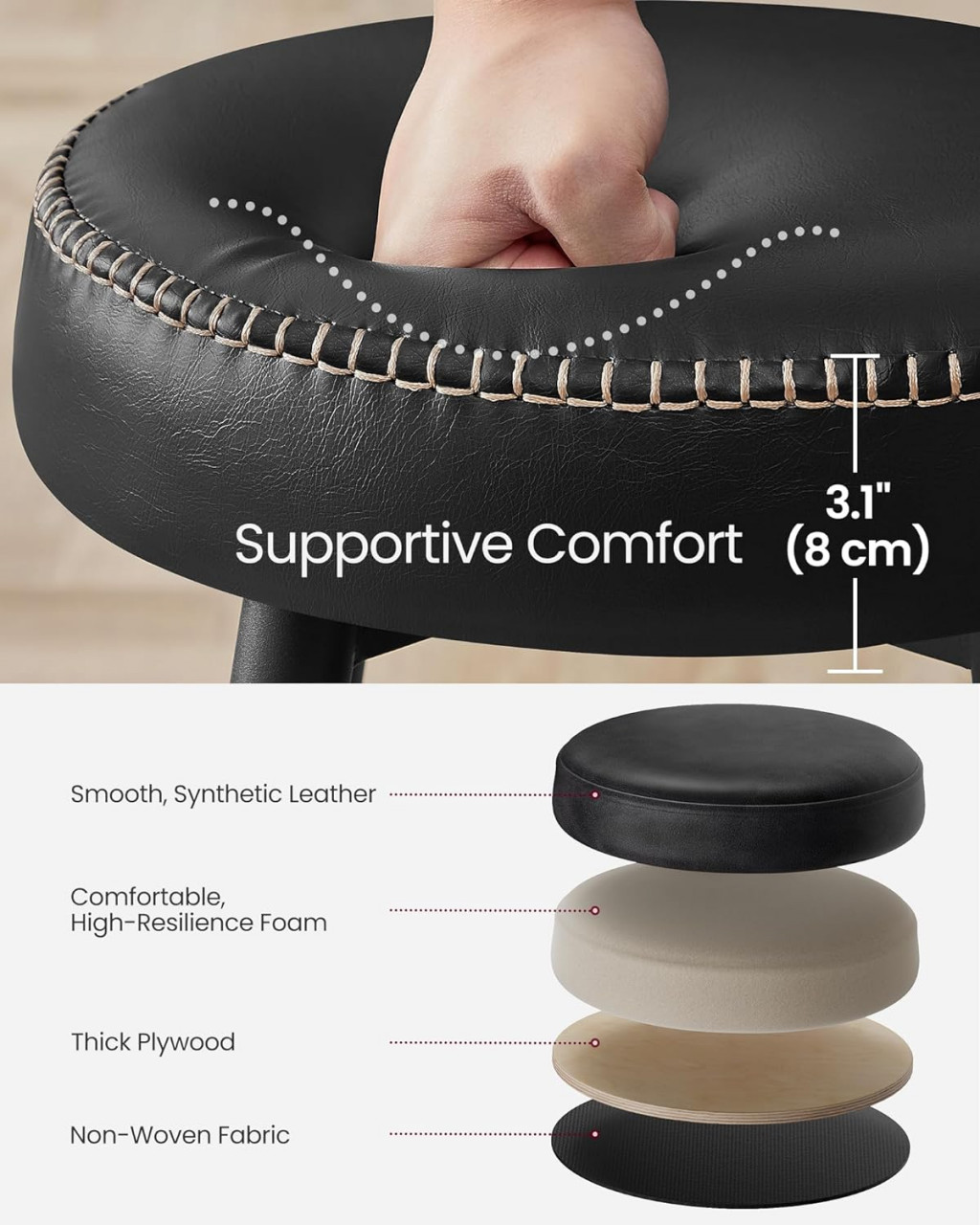 Îmbunătățiți-vă spațiul cu setul de 2 scaune de bar Vasagle, ce combină pielea artificială elegantă cu cusături rafinate și picioare conice. Confortul este asigurat de spuma de înaltă reziliență de 3,1 inci, oferind o experiență de ședere plăcută și durabilă. Suporturile pentru picioare în trepte se adaptează ușor prietenilor de toate înălțimile, iar picioarele pivotante asigură stabilitate pe orice suprafață. Curățarea este simplă datorită materialului rezistent la apă, iar picioarele din oțel mat își păstrează farmecul chiar și la utilizarea zilnică.