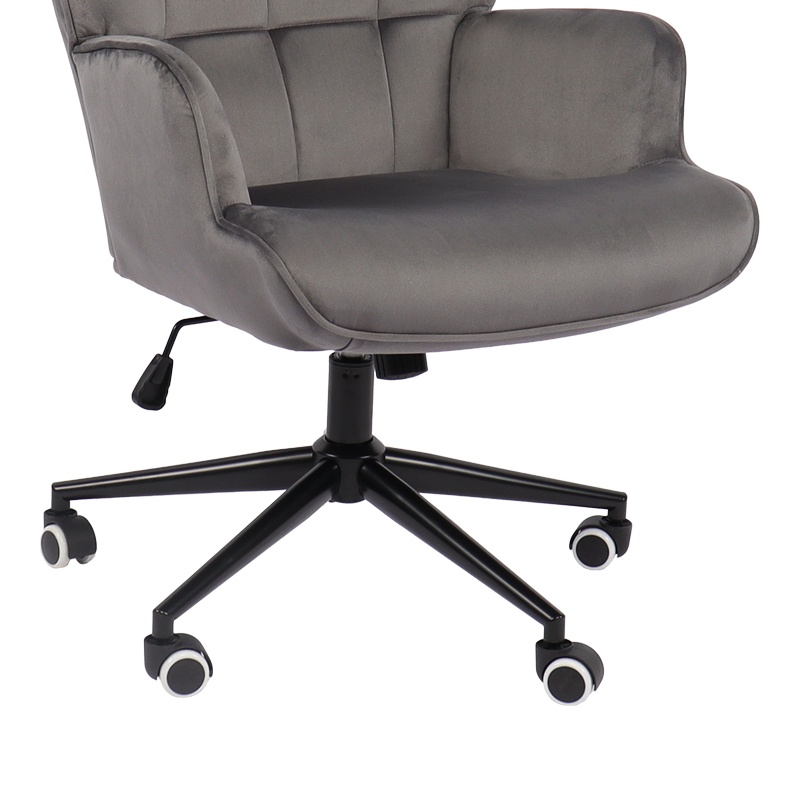 Scaunul birou Lobima Gri închis îmbină confortul ergonomic cu un design elegant. Cu un spătar înalt, capitonat și tapițerie din catifea velvet 100% poliester, acest scaun oferă suport lombar eficient, ideal pentru orele de lucru. Baza pivotantă din metal negru asigură mobilitate ușoară, iar umplutura din spumă menține forma și confortul. Dimensiunile sale ergonomice, cu înălțimea șezutului de 45 cm și adâncimea de 44 cm, îl fac perfect pentru birou sau living. Produsul se livrează dezasamblat, cu ghid de asamblare inclus. Transformă-ți spațiul de lucru cu stil!
