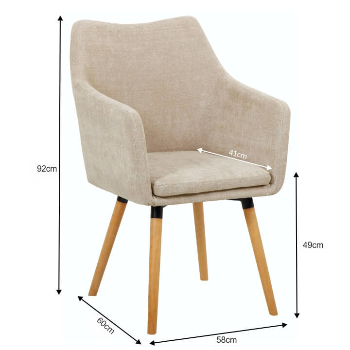 Fotoliul pentru masă DABIR, cu o tesătură elegantă de culoare bej și cadru din lemn de fag, aduce un plus de confort și stil în orice spațiu. Cu dimensiuni compacte - lățime de 58 cm, adâncime de 60 cm și înălțime de 92 cm - acesta se integrează perfect în mediul dorit. Înălțimea șezutului este de 49 cm, iar adâncimea șezutului de 41 cm, oferind o experiență plăcută în utilizare. Cu o capacitate de încărcare de 110 kg, fotoliul este robust și durabil. Livrat demontat, ușor de asamblat, DABIR este alegerea ideală pentru momentele de relaxare.